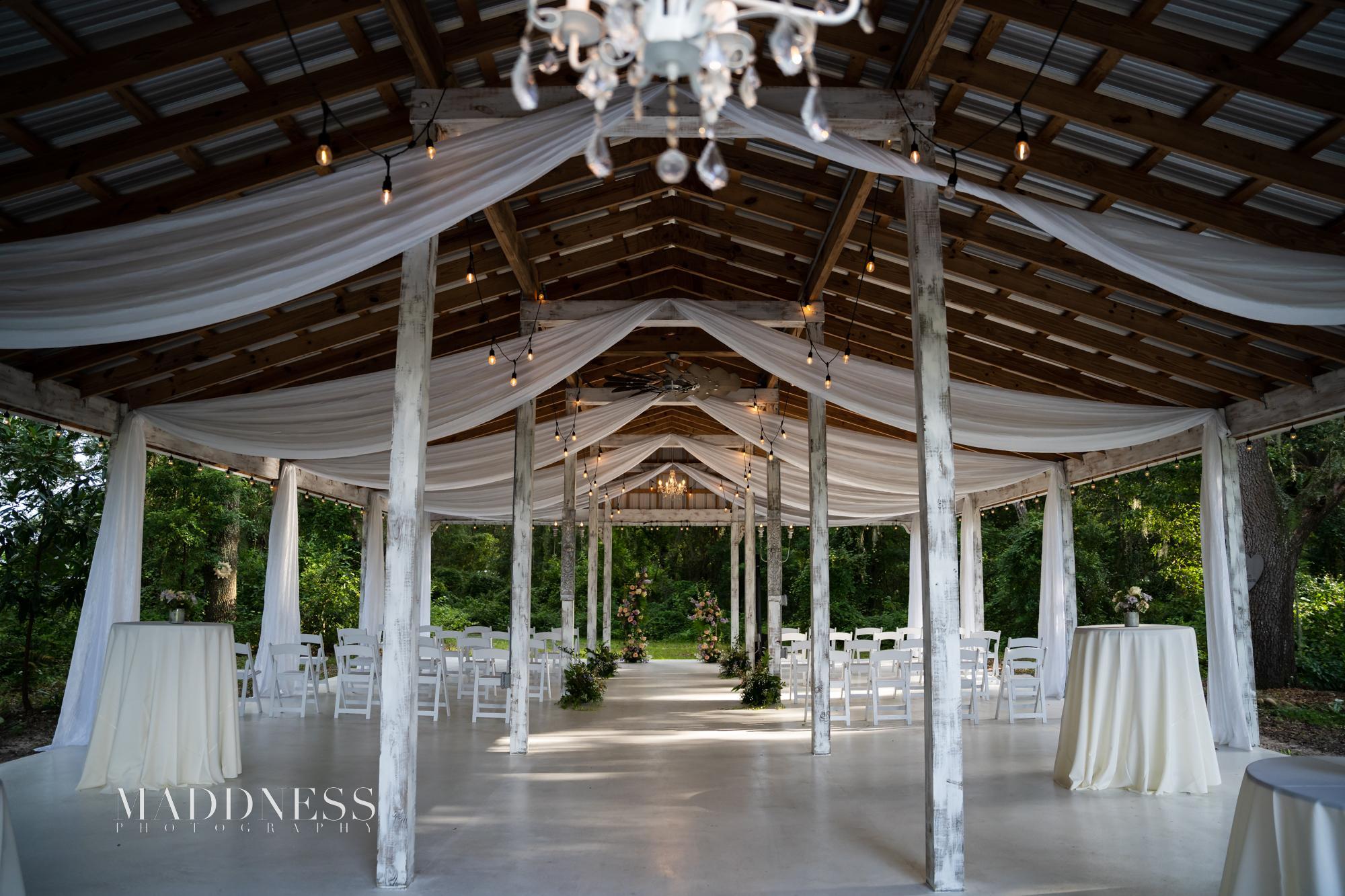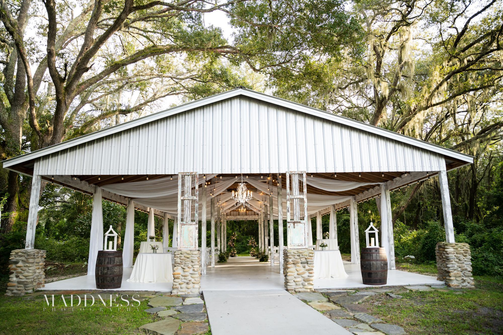 More than just a Wedding; a Wedding Weekend to Remember!! Welcome to the scenic and serene countryside of Legacy Lane Weddings, a hidden gem located in Brooksville, FL on a 120-acre farm. A unique venue with several indoor and outdoor ceremony and reception locations with whole weekend accommodations for the Bride and Groom and up to 50 of their closest family and friends, which allows for a weekend long celebration to remember. Our in-house event coordinators and decorators will help you make your dream wedding come true. We can accommodate your wedding of up to 140 guests. Legacy Lane offers several outdoor Ceremony and Cocktail locations including the Grand Oak Ceremony Tree outfitted with pavers and turf for the comfort of your guests, or the open-air Pavilion adorned with rustic accents and chandeliers. The Legacy Barn is a completely renovated, air-conditioned former horse barn, transformed to a now a gorgeous, light and airy ,picturesque perfect reception space.