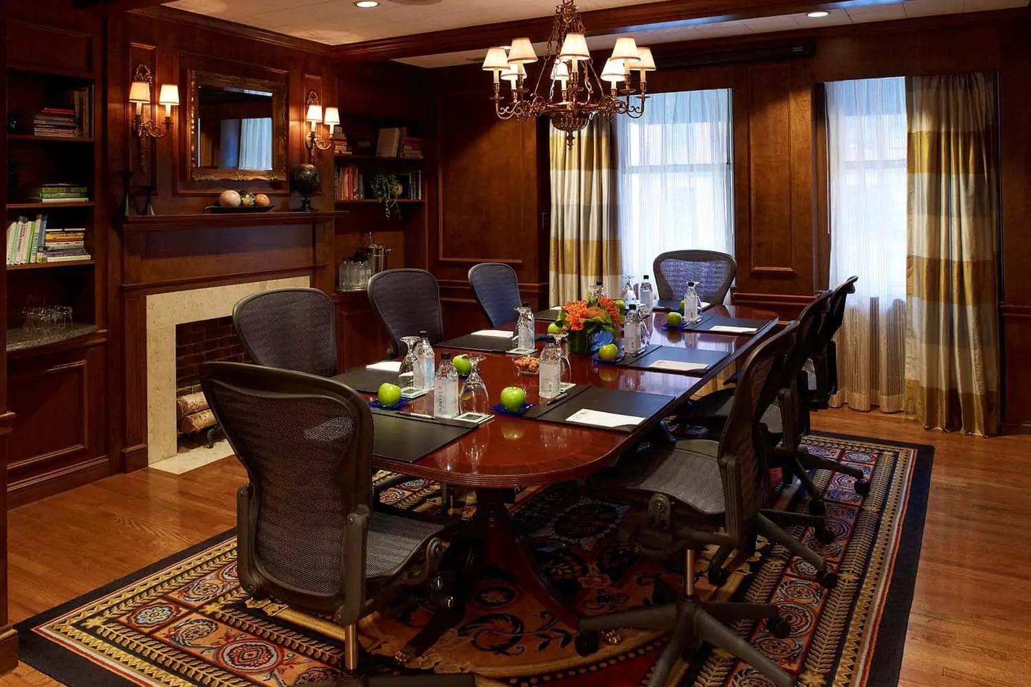 The Boardroom is a classically elegant seated conference room overlooking bustling Boylston Street. This space accommodates 8 in oversized leather executive chairs around a solid cherry boardroom table next to a fireplace and library wall.