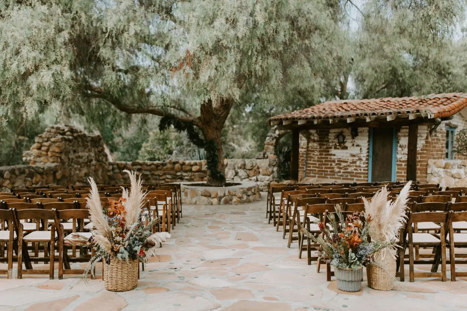 Picture yourself walking down a sun-dappled stone path toward your ceremony beneath a canopy of ancient pepper trees. The Leo Carrillo Ranch ceremony area is a romantic haven surrounded by wildflowers, bougainvillea, and the whisper of a coastal breeze. Choose from two stunning ceremony sites, each offering its own unique ambiance from the rustic elegance of the Hacienda backdrop to the open-air charm of the garden lawn. As guests gather among adobe walls and historic arches, they’re enveloped by the golden glow of the California sun and the tranquil melody of nature. The Ranch’s sprawling grounds provide endless photo opportunities, from secluded nooks beneath the trees to panoramic vistas that glow at sunset a dream setting for your “I do.”