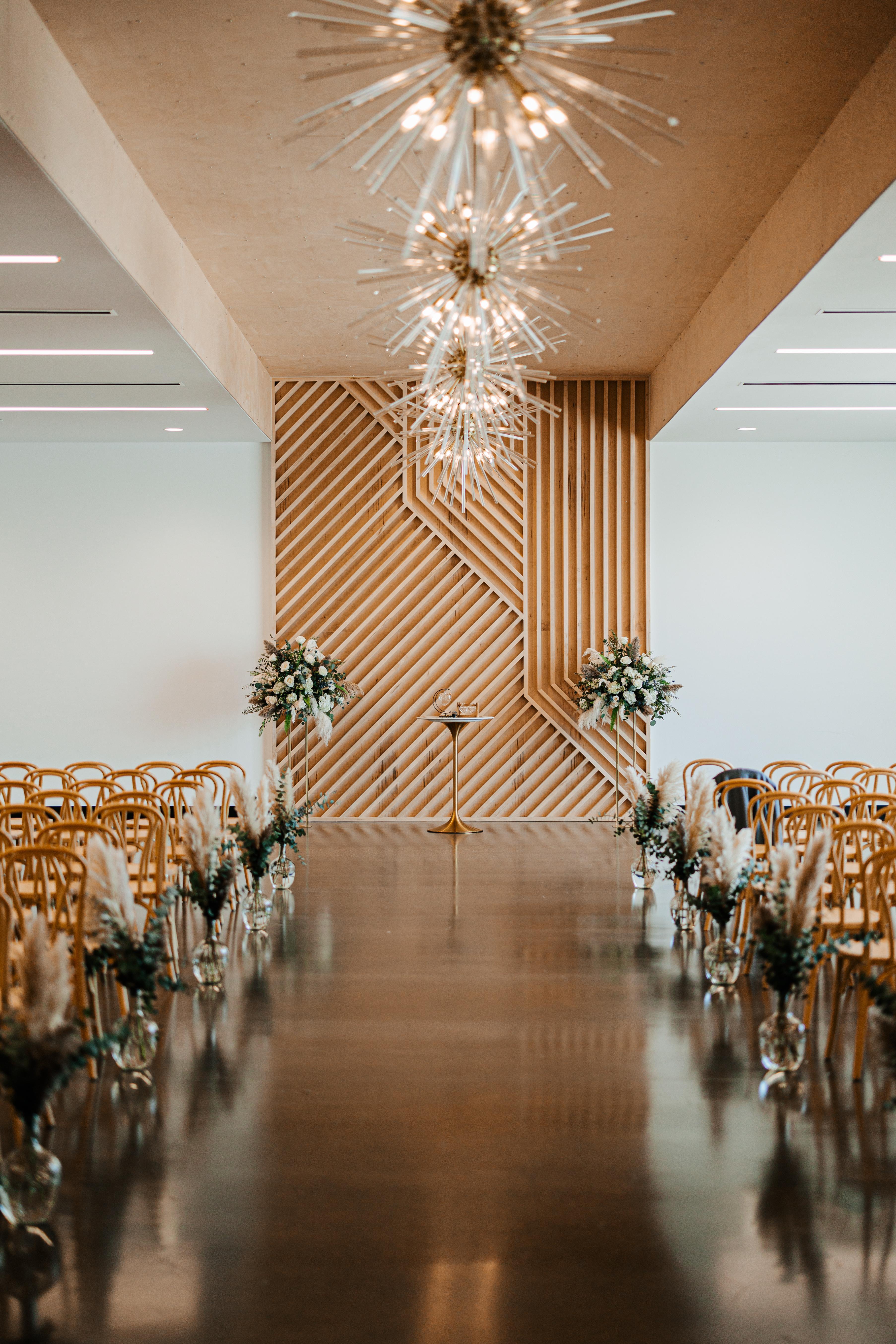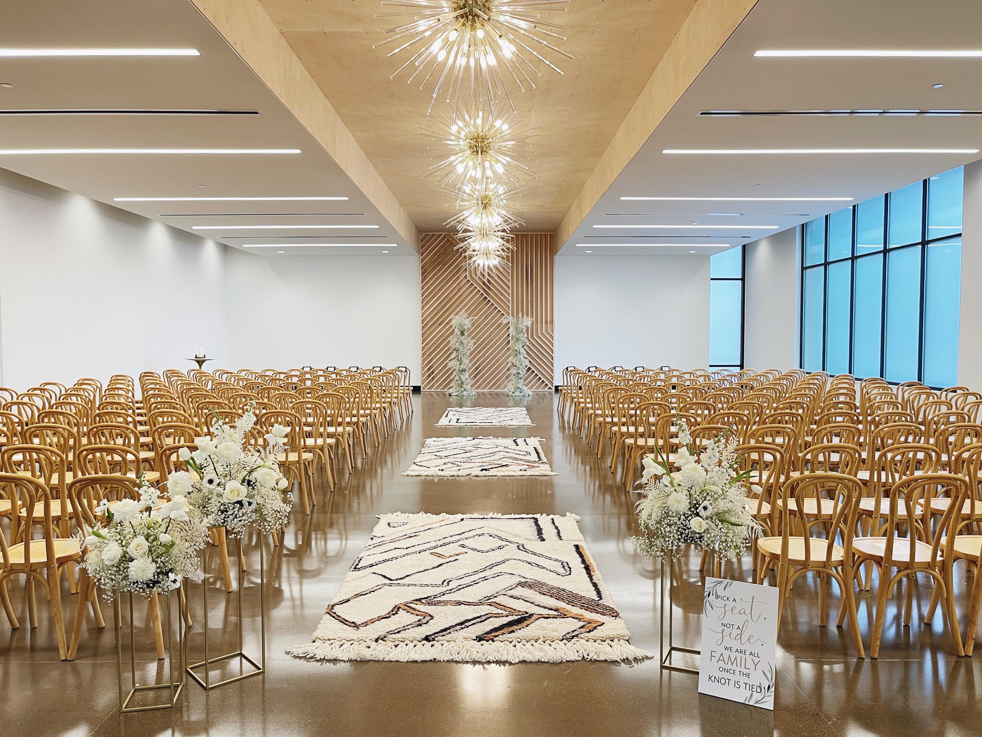 Step into our stunning modern Scandinavian ceremony space, where timeless elegance meets minimalist design. Located in a beautifully renovated old schoolhouse, this venue features polished concrete floors, natural bentwood chairs, and a striking wooden accent wall that serves as a perfect focal point. Textured rugs line the aisle, adding warmth and character. The ceremony space can comfortably accommodating up to 300 guests for your unforgettable day.