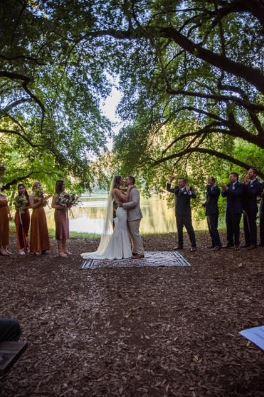 This space is nestled under Bay tree canopy with a view of the glistening water from the lake in the back ground. The trees form a beautiful natural arch over the couple and bridal party.