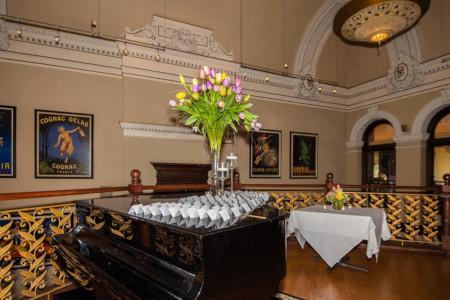 Our open-edge Piano Bar is located in the heart of Lightfoot. Surrounded by elegant wooden rails and featuring views our incredible soaring ceiling and silk venetian chandeliers, the Piano Bar may be reserved along with the adjacent Sheridan Room. It can be used for presents or favors, a private bar, or a unique conversation area. Use of the piano is limited to professional players. Lightfoot is happy to make a recommendation.