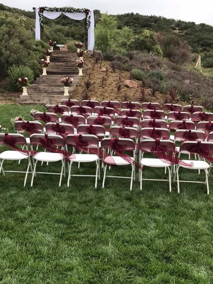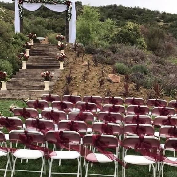 The space features 9 acres of a tiered green lush property lined with Lavender and railroad tie staircases. among the surrounding wilderness. Nestled up against Bogart park. located just a short distance from Oak Glen. the actual venue area is 100x50 which will accommodate up to 100 guests with railroad tie stairs up to Alter and railroad tie stairs down to parking area.