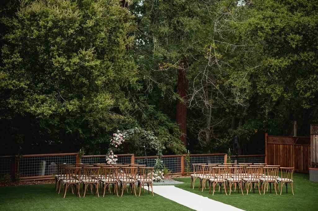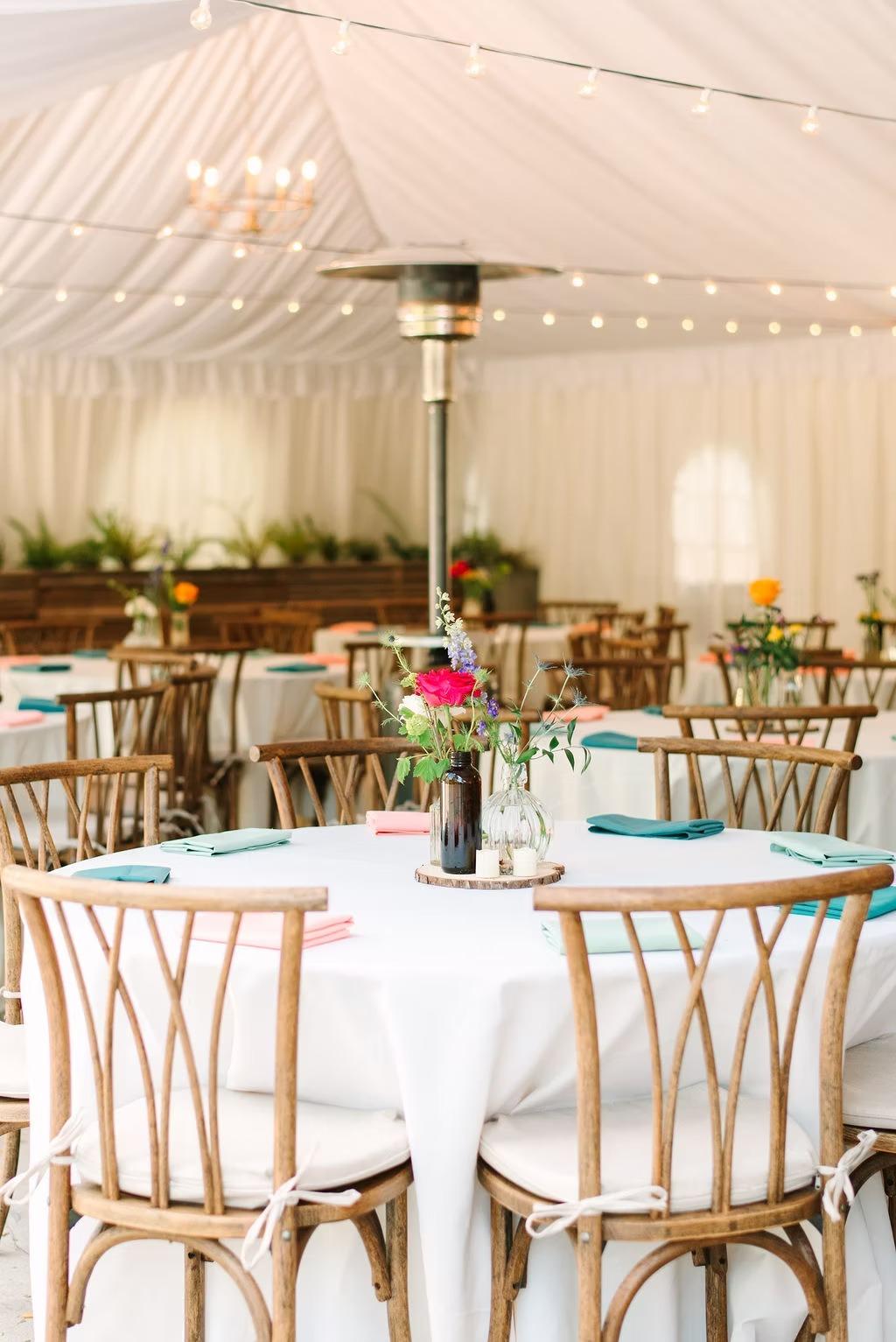 We offer in-house catering with wait staff who do all the set up and clean up. We provide round tables, Willow chairs for the reception, white ceremony chairs, cocktail tables and two charming tented spaces as well as a chic bar set up. We have onsite restrooms, a large list of in-house rentals, onsite parking, and just about anything you need to make your wedding day a success.