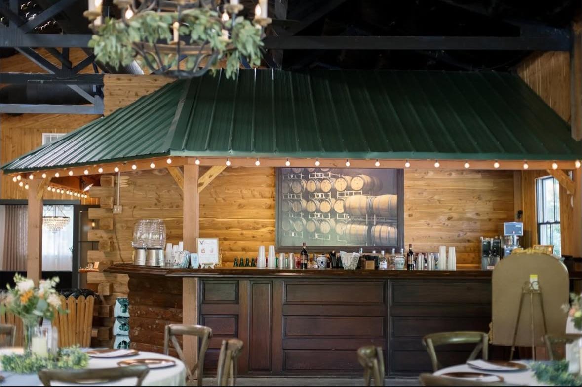 This newly renovated space features open beamed ceilings, sweeping draperies and thousands of twinkle lights creating night sky feels as the evening unfolds. Floor to ceiling windows and giant slider doors overlook our private little collection of grape vines. Local, hand-milled cedar walls create a cozy backdrop for a night that will be remembered forever. A wrap around porch with lounge seating ensure that guests can relax and enjoy the evening air regardless of the weather.