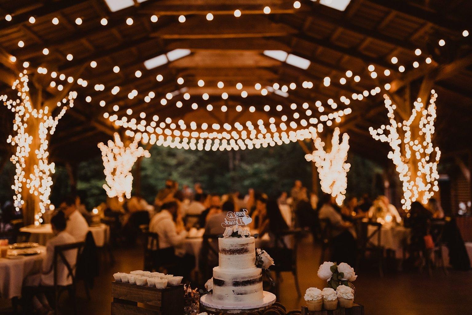 The pavilion boasts open beams, a ceiling of patio string-lights and pillars covered with twinkling birch branches. Guests stay comfortable in this shady sanctum equipped with patio heaters and built-in fans. With a custom bar and adjacent restrooms, this outdoor space is a perfect outdoor reception spot and ensures that couples don't have to stress about the weather. If you're lucky enough to have a little drizzle, the rich color of the damp forest is a gorgeous backdrop for a ceremony.