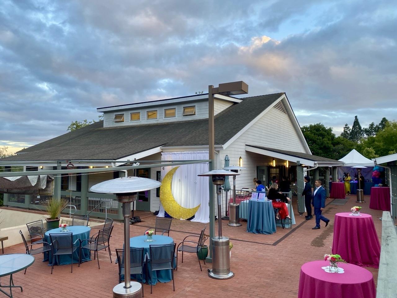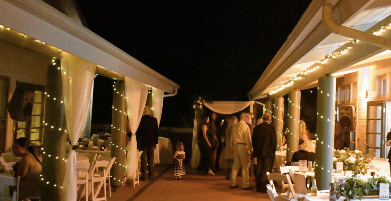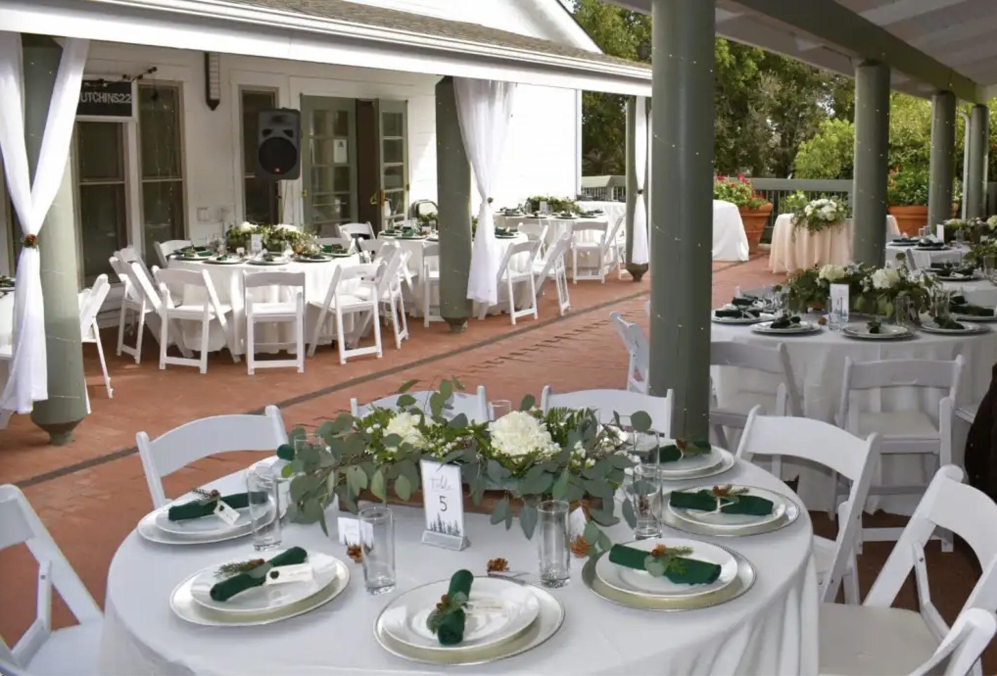 -Ideal for a small outdoor wedding -String patio lighting and fairy lights draped around columns -Round and rectangular tables and chairs provided -Three large rectangular tables on wheels for buffet, desserts, bar.