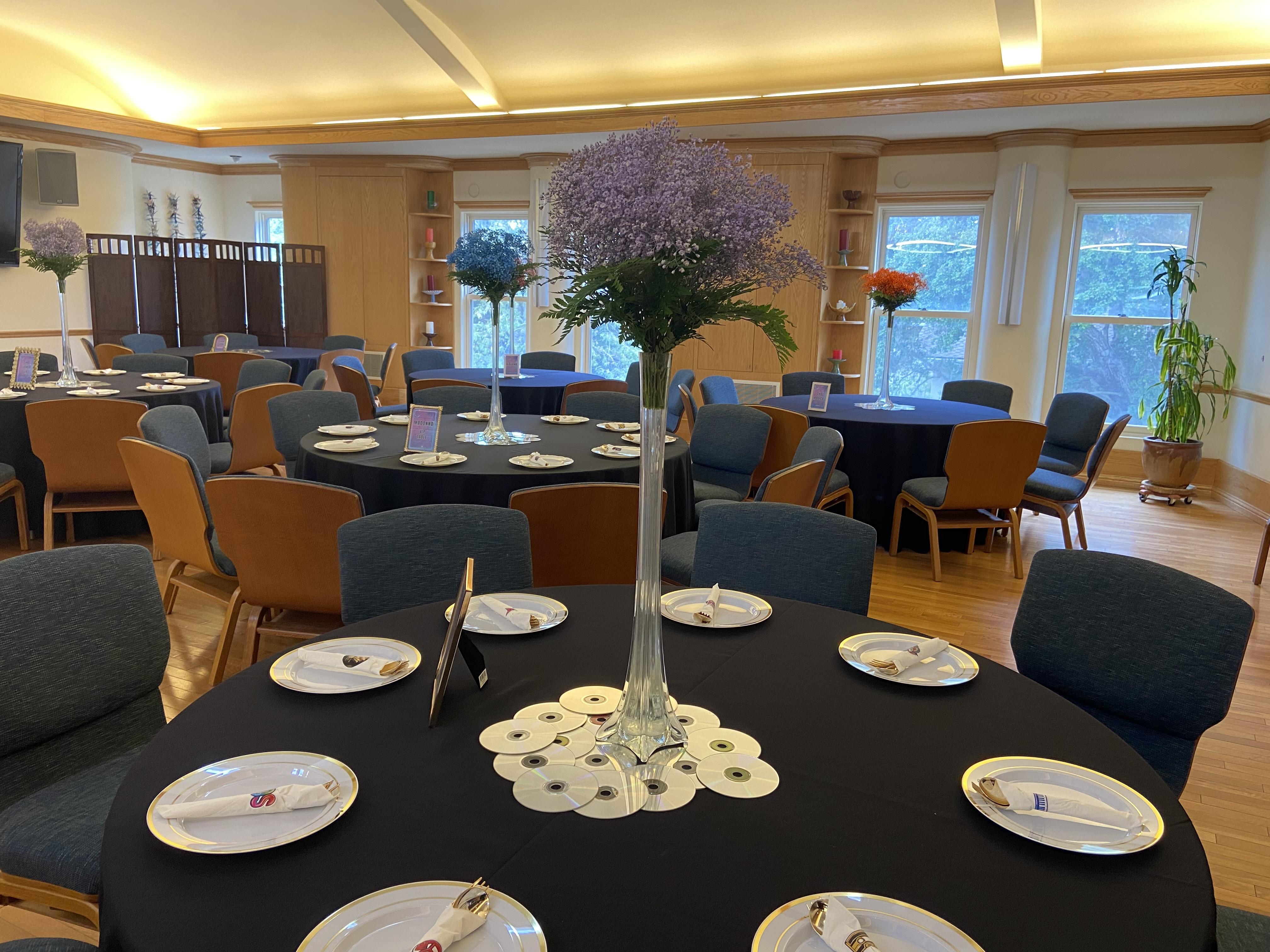 -Twelve round, 5-foot tables with chairs -Dance floor -Dining-capable -Combined with Sanctuary, this is a space where fun guest activities (photo booth, games...) can take place -Kitchenette with sink, small refrigerator, coffee makers...