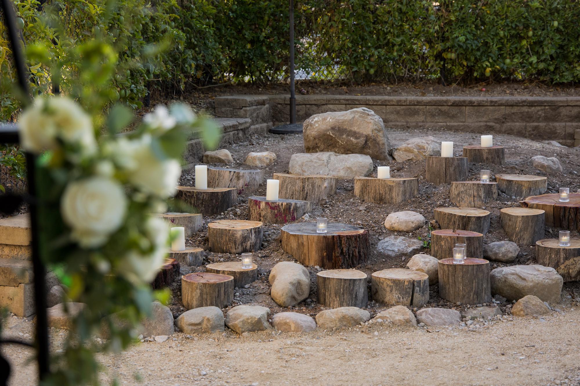 The Outdoor Sanctuary is situated near the historic and picturesque Water Tower - great for photos. Amphitheater seating, a small hill with boulders and tree stumps that can be decorated with candles and flowers or used for seating. A colorful garland of flags and string patio lights make it festive. Our iron-rod archway can add an additional decorative and framing element. Picnic seating beneath Coastal Live Oak trees.