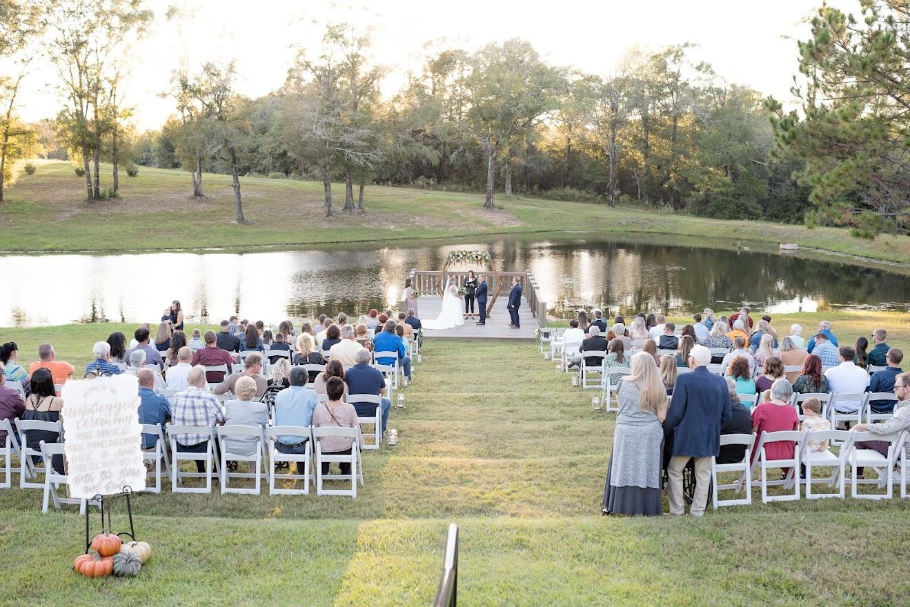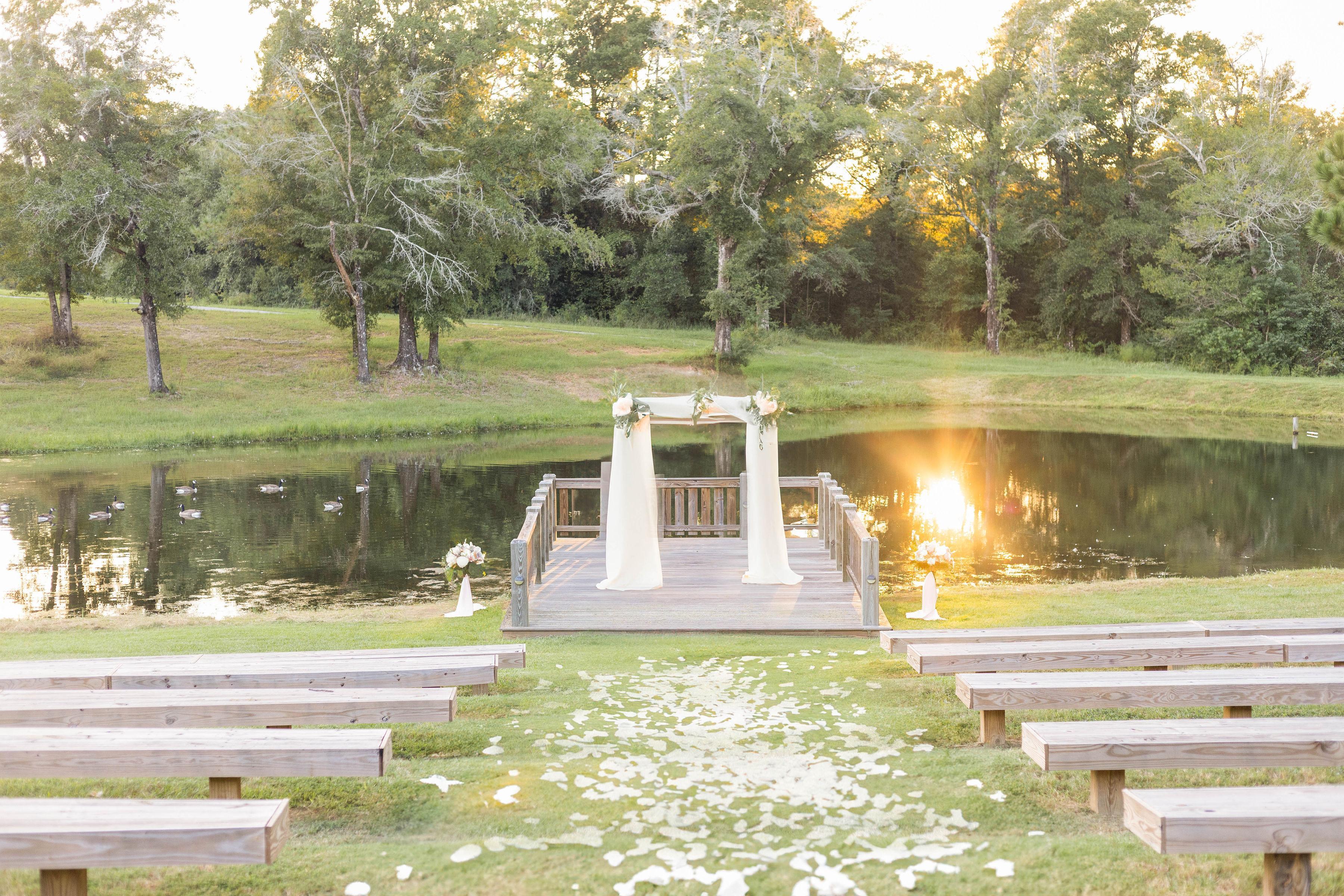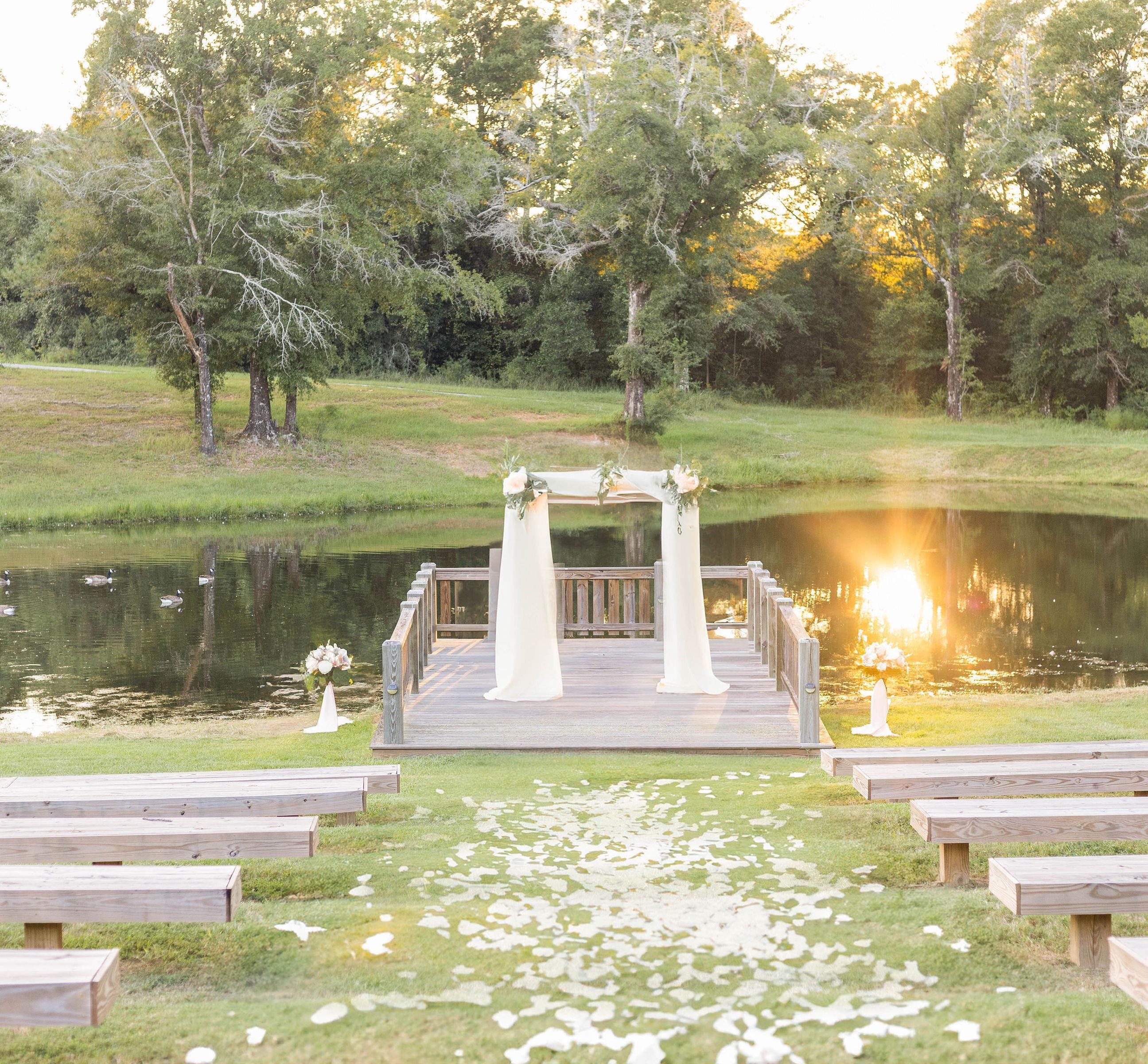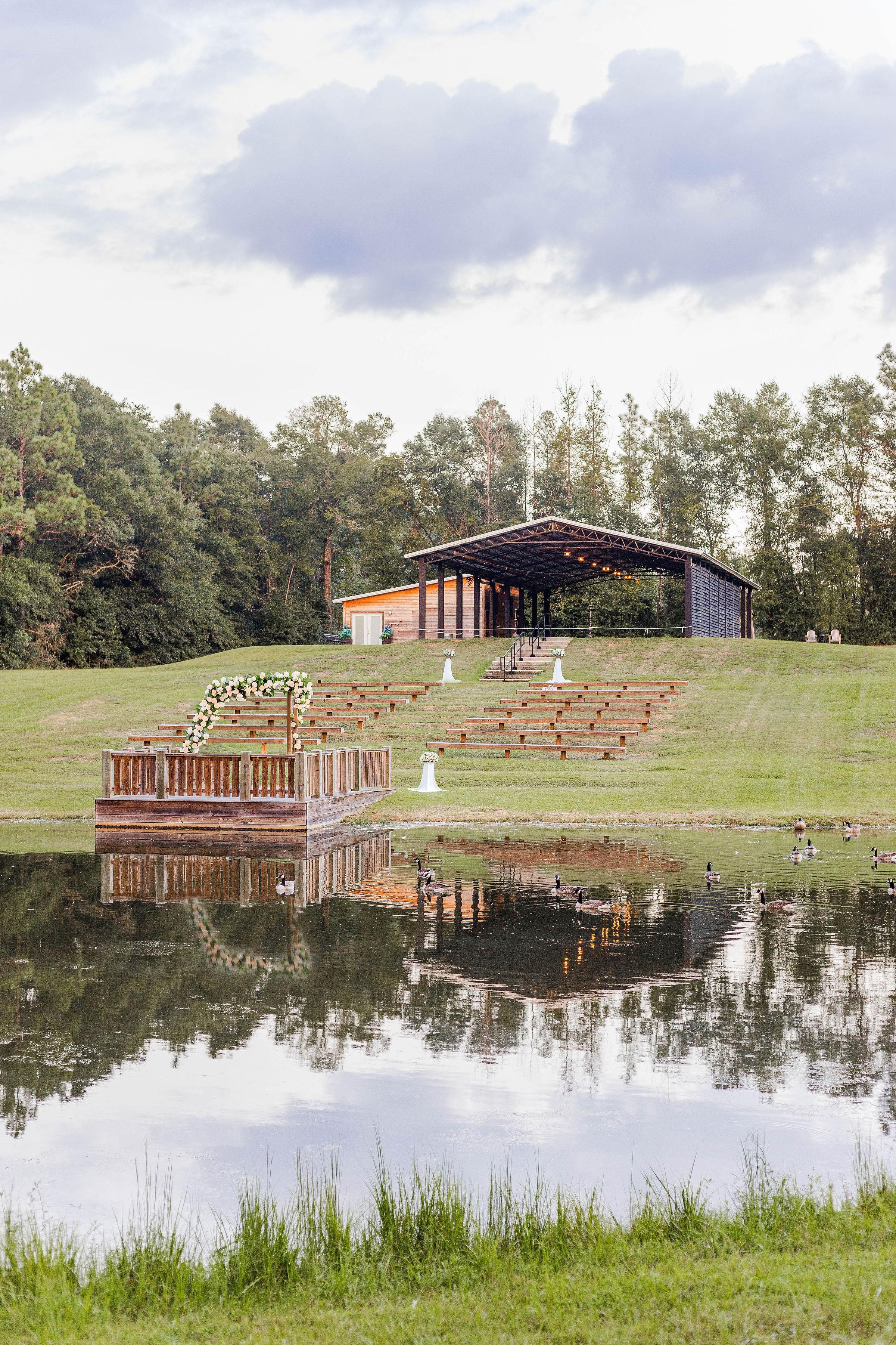 The most premier site at Loblolly Farm offers a gorgeous 3,400 square foot pavilion, vintage light fixtures, and a stairway leading down to the Lakeside Terrace. This location is the perfect setting for a stunning outdoor ceremony, with a beautiful deck on the Lake. This site is perfect for larger weddings and receptions and elegant dinner parties.