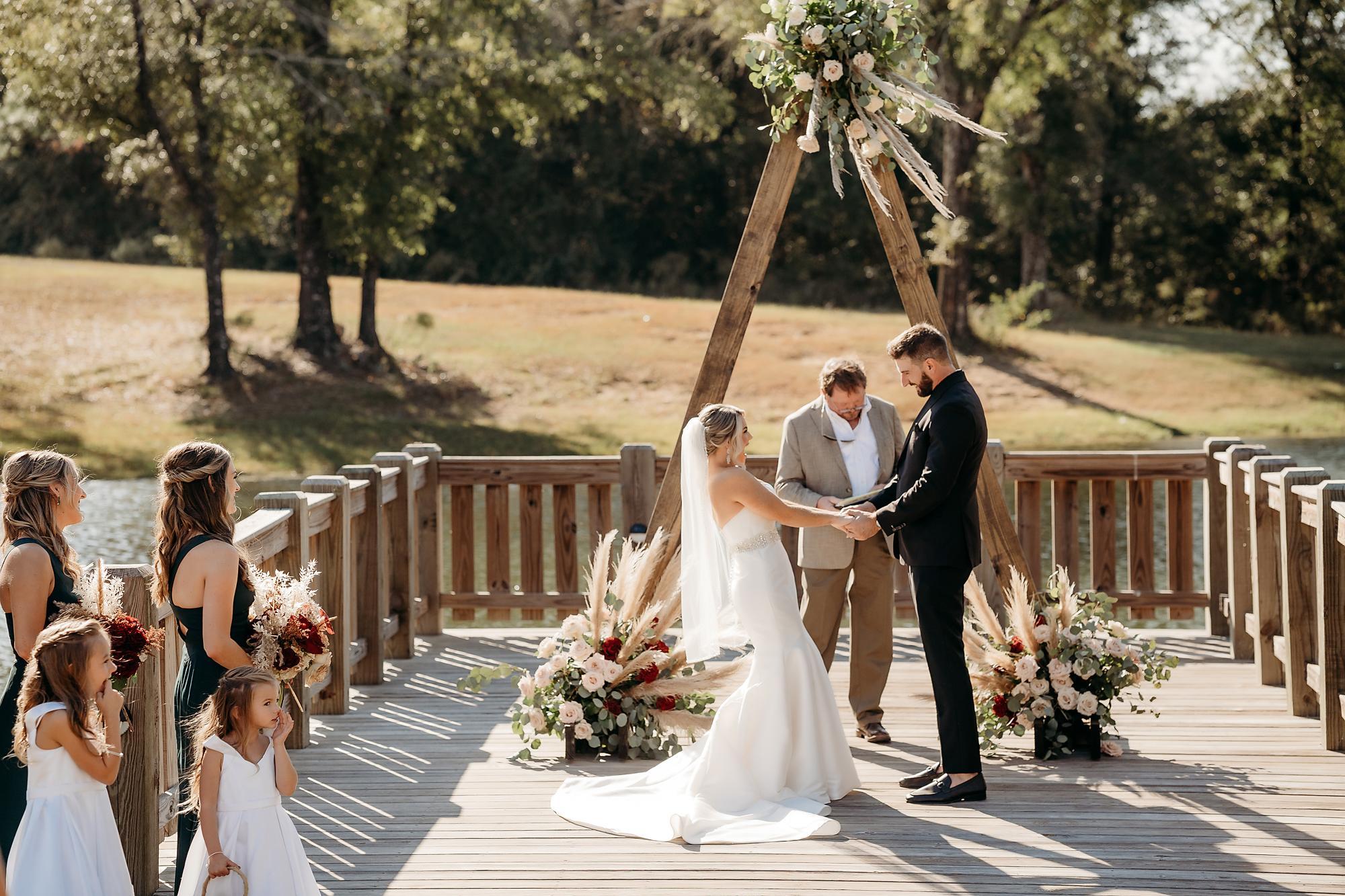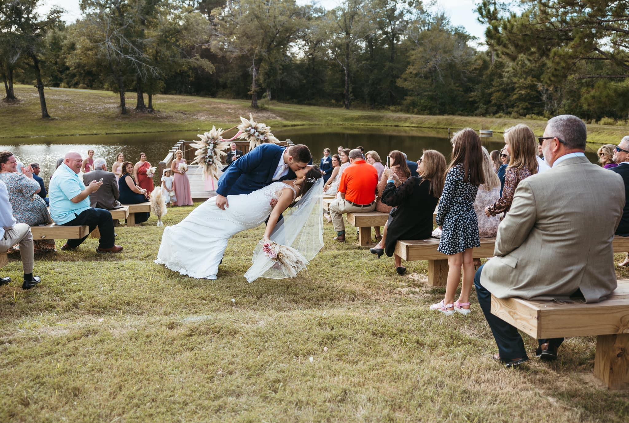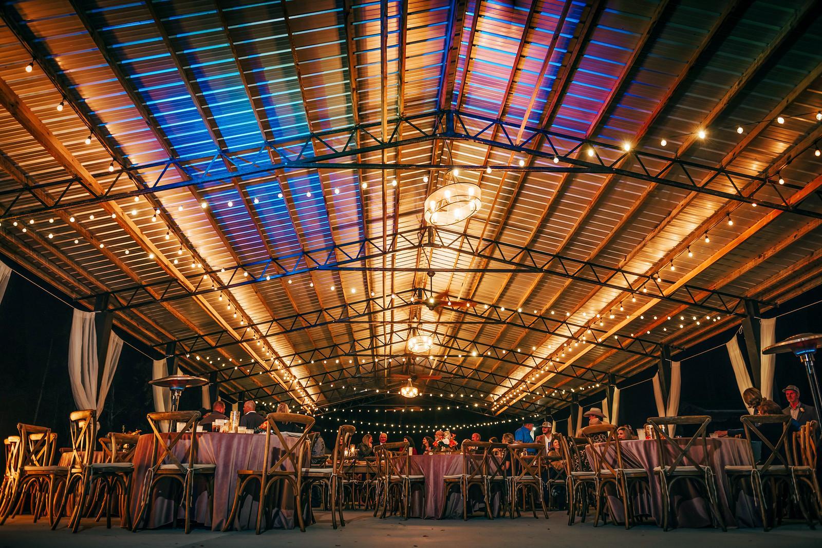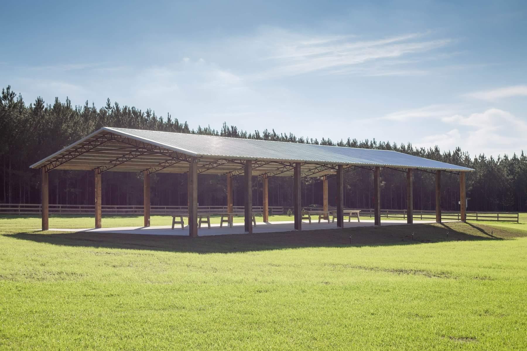 The most premier site at Loblolly Farm offers a gorgeous 3,400 square foot pavilion, vintage light fixtures, and a stairway leading down to the Lakeside Terrace. This location is the perfect setting for a stunning outdoor ceremony, with a beautiful deck on the Lake. This site is perfect for larger weddings and receptions and elegant dinner parties.
