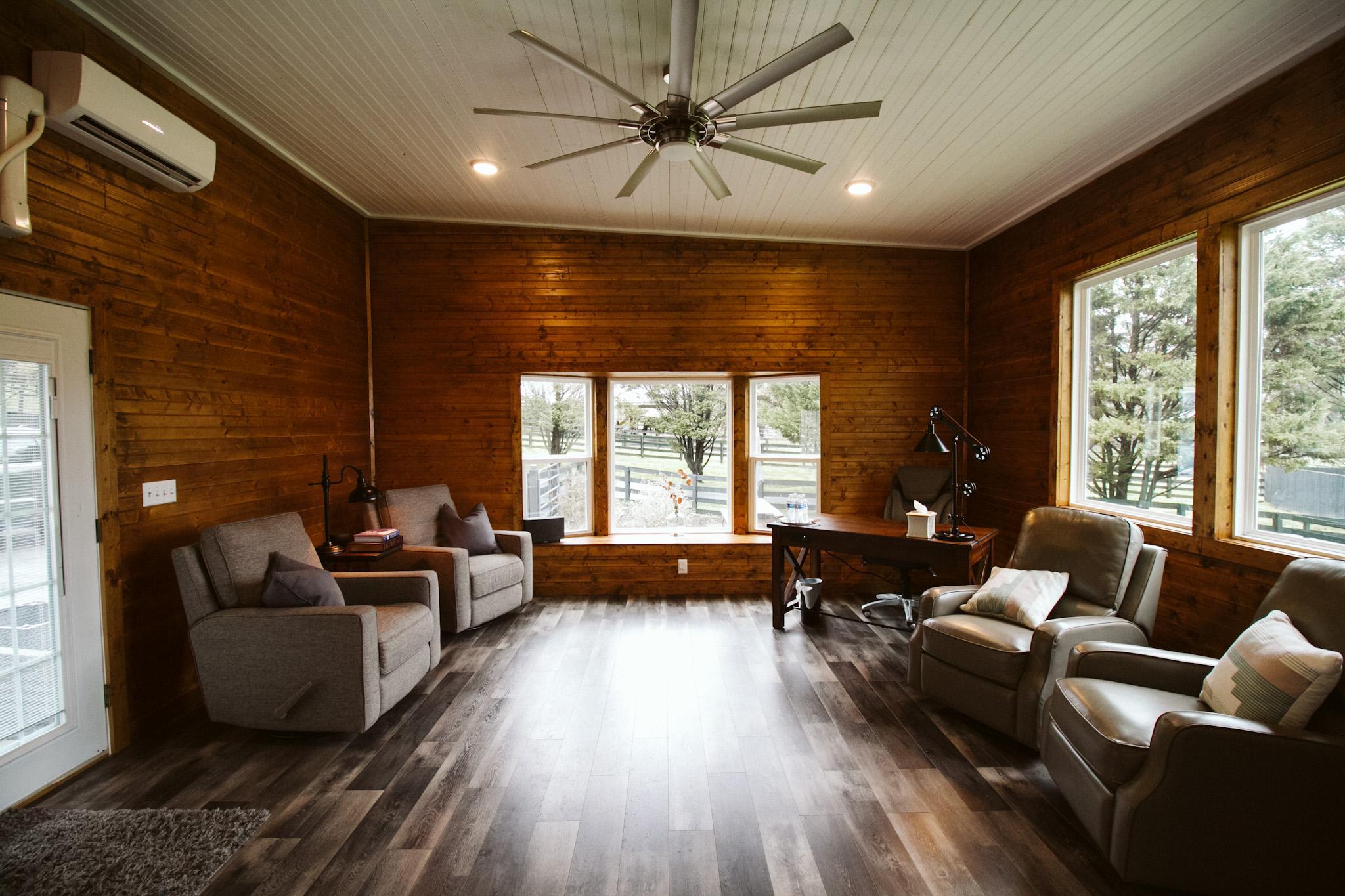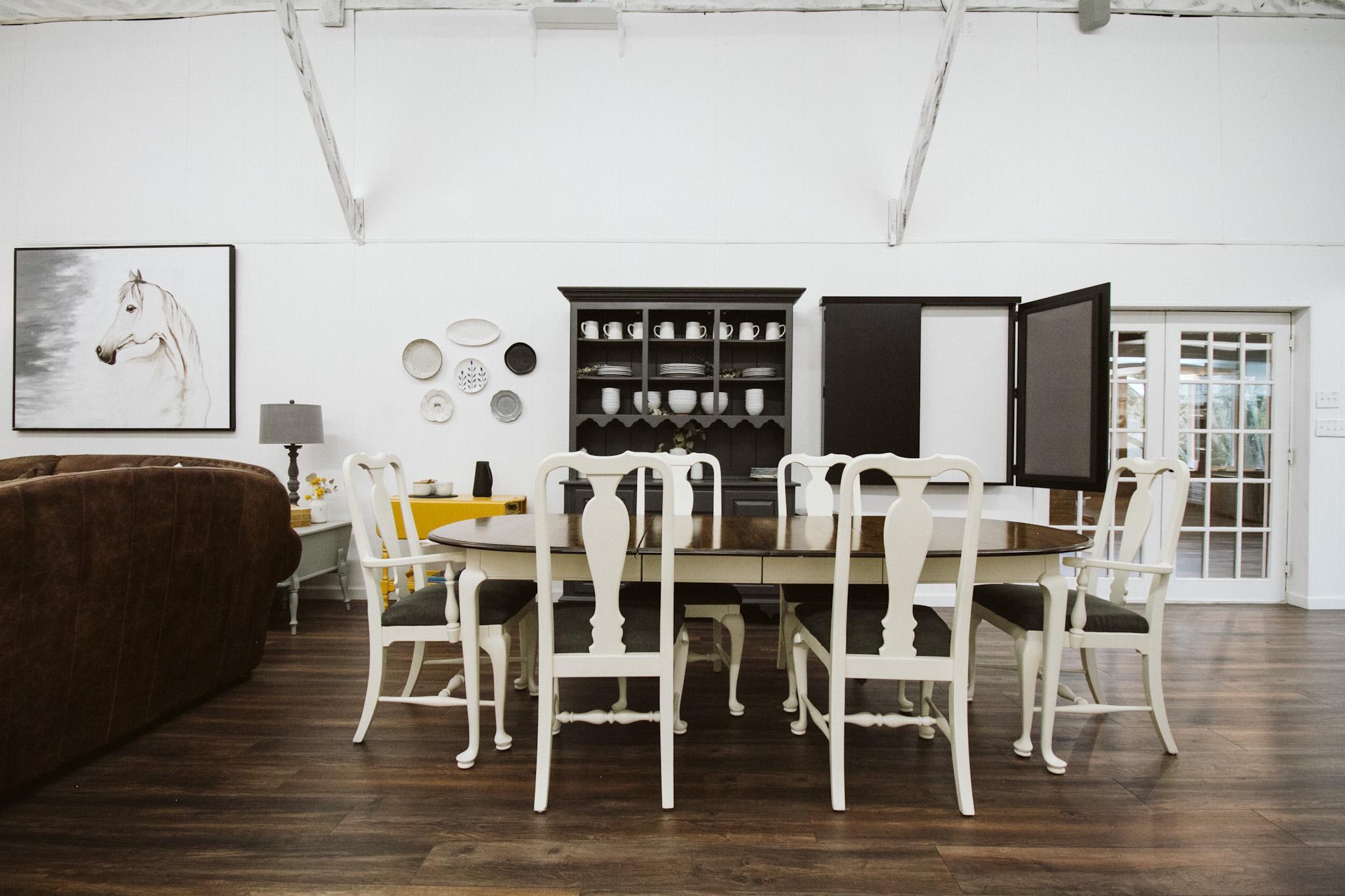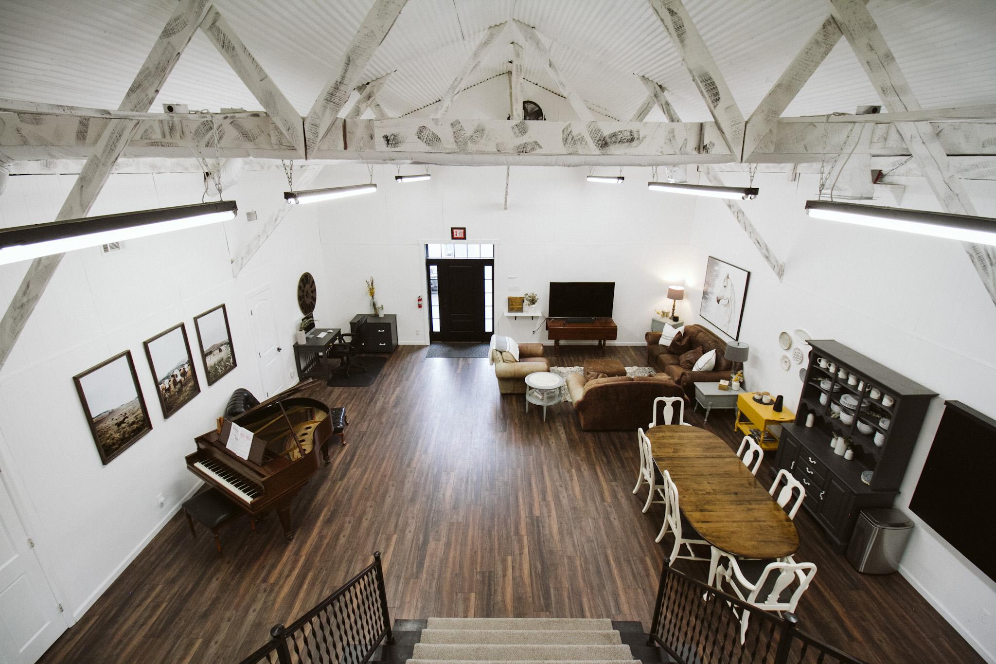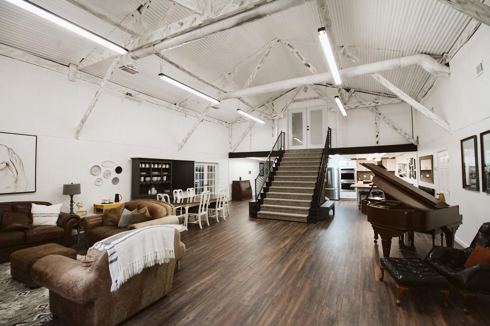 The Barn includes the reception hall, great room, bridesmaids prep room, groomsman prep room, full kitchen, photography studio, event room, foyer, two bathrooms and outdoor areas.