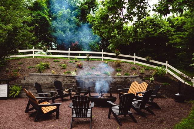 - Adirondack Chairs - Market Lighting - Natural Wood Stumps - Cozy Fire Pit