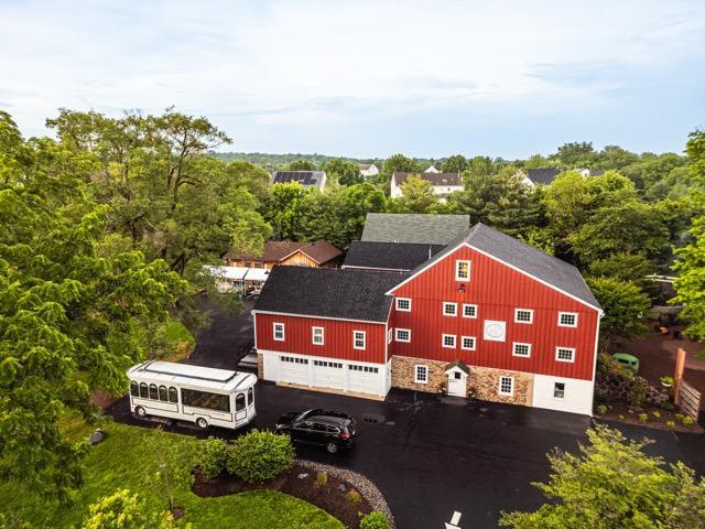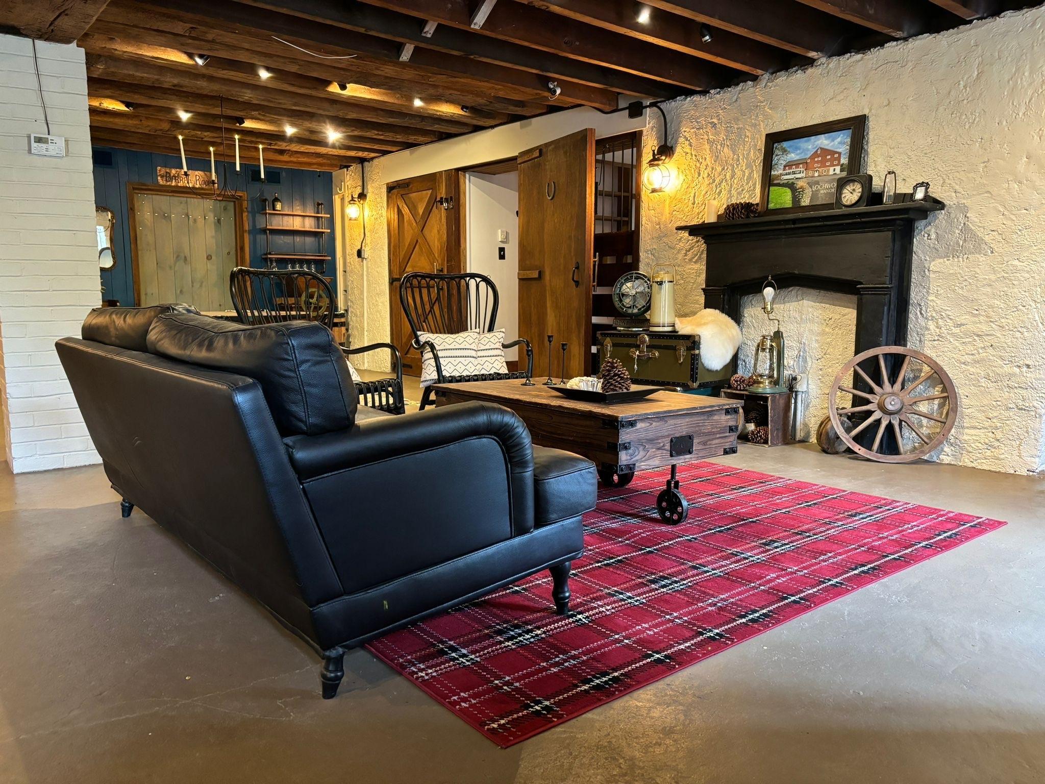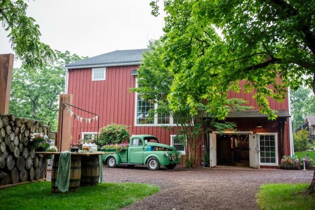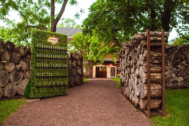 - Accommodates an indoor/outdoor cocktail hour or small events - Beautiful hand-carved copper bar - Hanging mason jar chanedlier - Aged Wine Barrel Cocktail Tables - Pellet Stove and Leather Couches - Raw Edge Countertops for Food Displays - Greenery Photo Wall with customizations available!