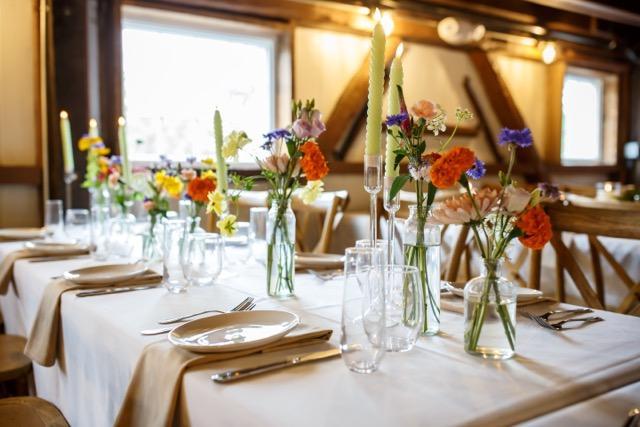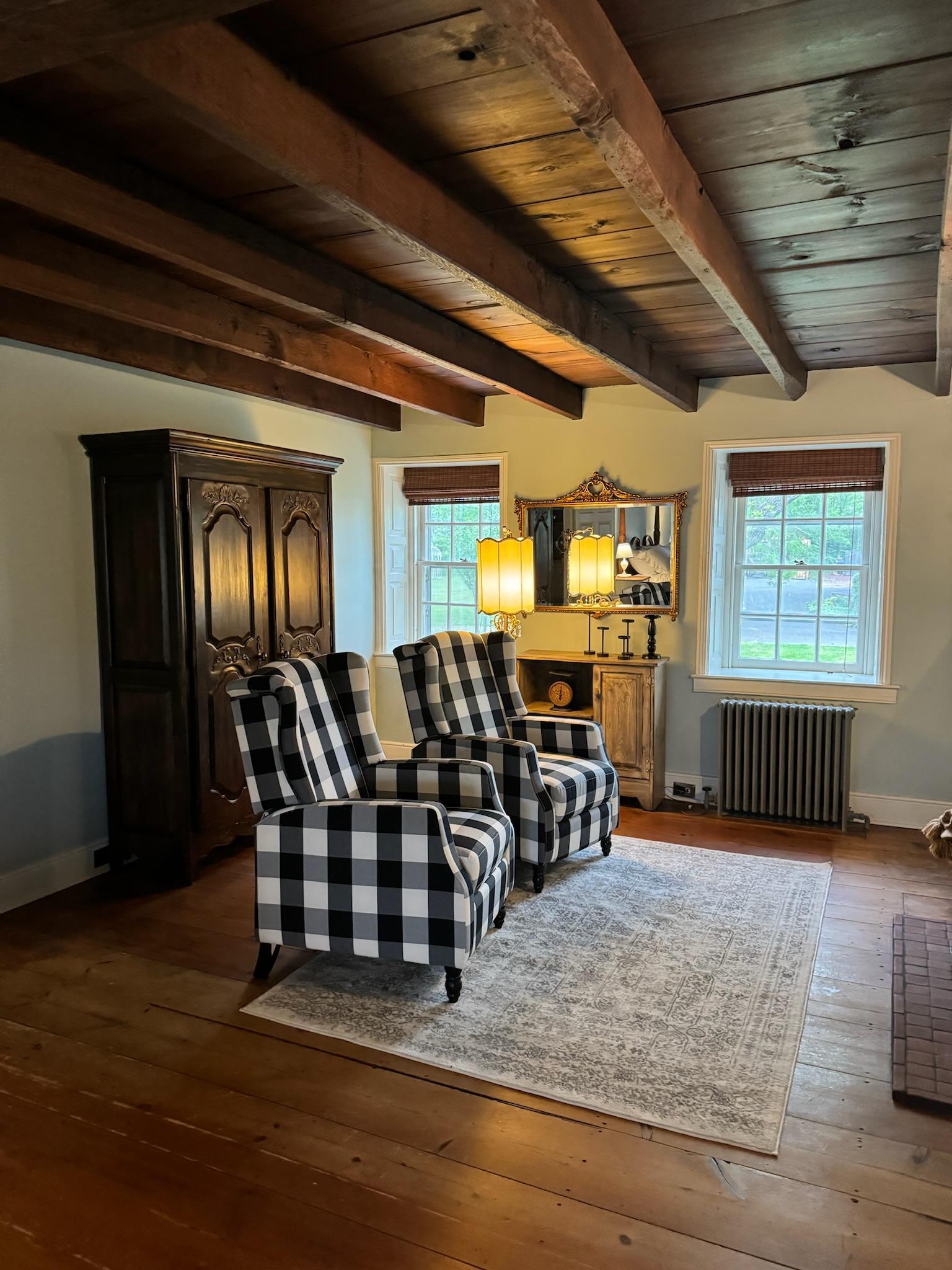 Blending rustic charm with modern elegance, the Ballroom features hand hewn beams and beautiful pine floors that are original to the barn creating a space full of vintage charm. Floor-to-ceiling windows and extra large French doors assure this space is flooded with natural light. It accommodates up to 200 guests, ideal for both intimate gatherings and large celebrations. This space offers a versatile, unforgettable setting for any celebration.