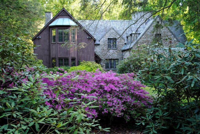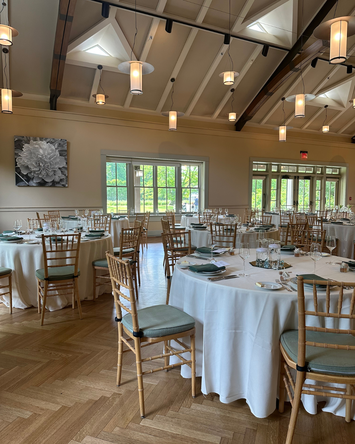 Our West Gallery offers a unique setting for weddings & private parties. Guests can enjoy cocktails on the covered terrace and shaded courtyard, then dine and dance in an elegant gallery with hardwood floors, a cathedral ceiling, three walls of windows, and French doors providing access to the estate’s gardens and grounds. This space comfortably accommodates between 50 and 150 guests for dinner and dancing.