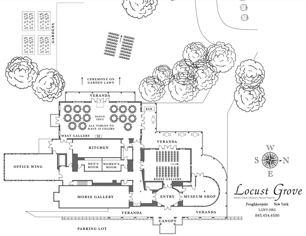 Locust Grove Estate is an unforgettable setting for weddings throughout the year, overlooking the Hudson River that combines the charm of the 19th century with the comfort of the 21st. Our West Gallery, located in the Arts-&-Crafts style Museum Pavilion, offers a unique setting for weddings. Guests can enjoy cocktails on the covered terrace and shaded courtyard, then dine and dance in an elegant gallery with hardwood floors, a cathedral ceiling, and three walls of windows and French doors providing access to the estate’s 200 acres of gardens and grounds. The West Gallery comfortably accommodates between 50 and 150 guests for dinner and dancing, while the adjacent Garden Lawn may also be rented for a ceremony overlooking the perennial gardens. For your convenience, the rental includes tables and chairs, a caterer’s kitchen, air conditioning, ample restroom facilities, and easy parking. Locust Grove only schedules one event each evening, so you and your guests are assured privacy.