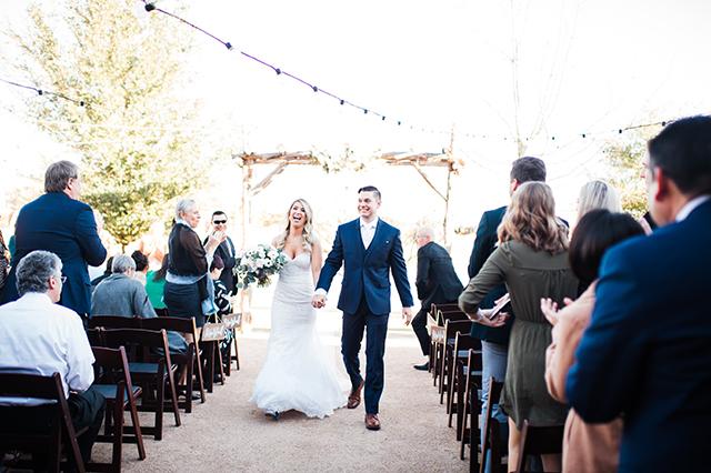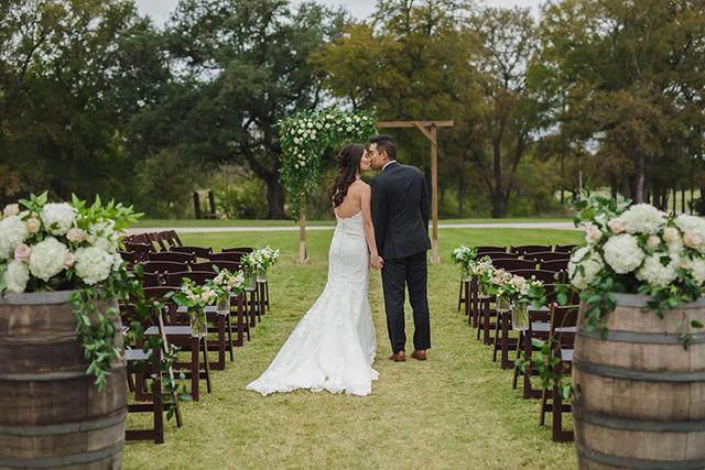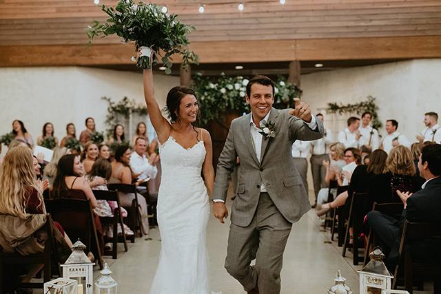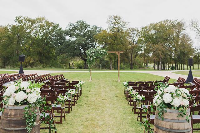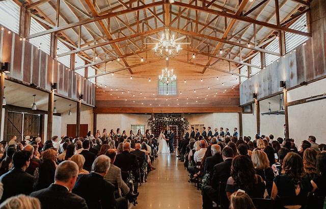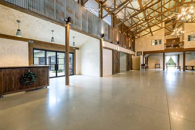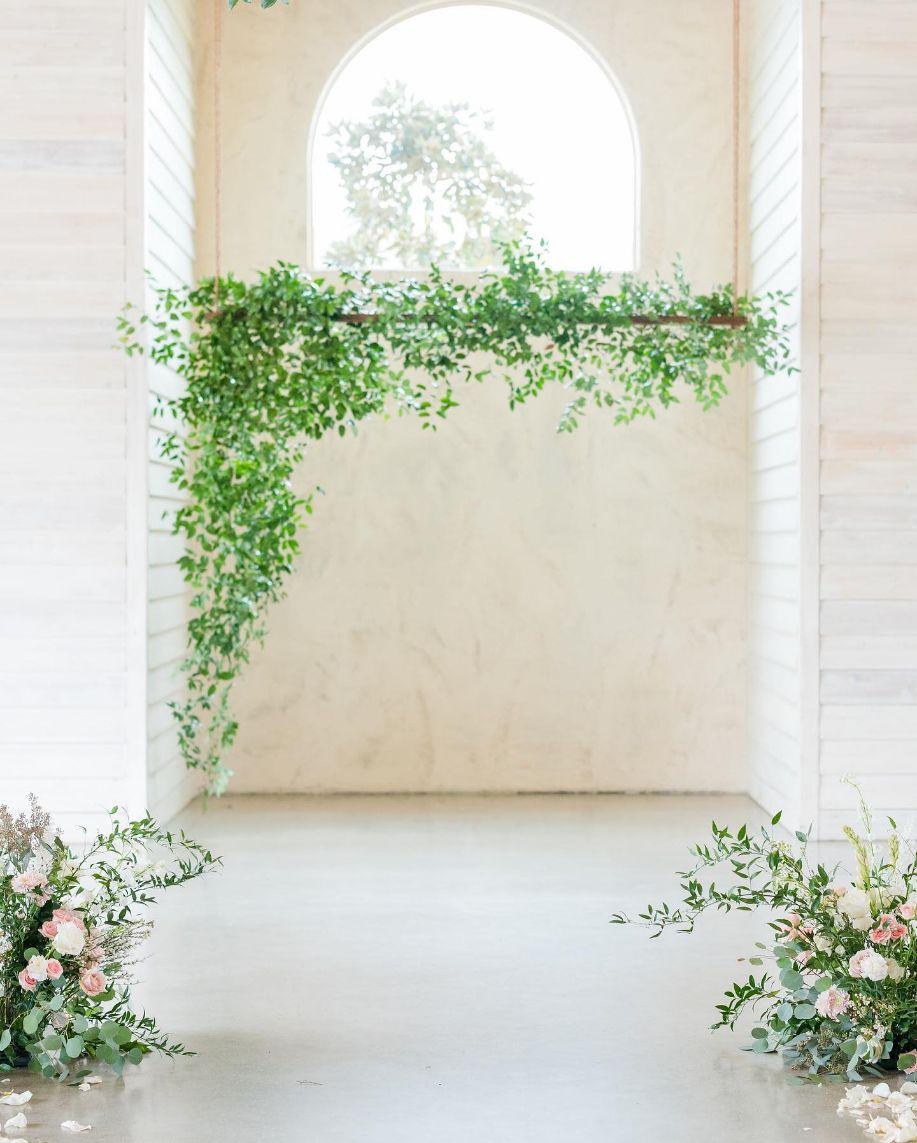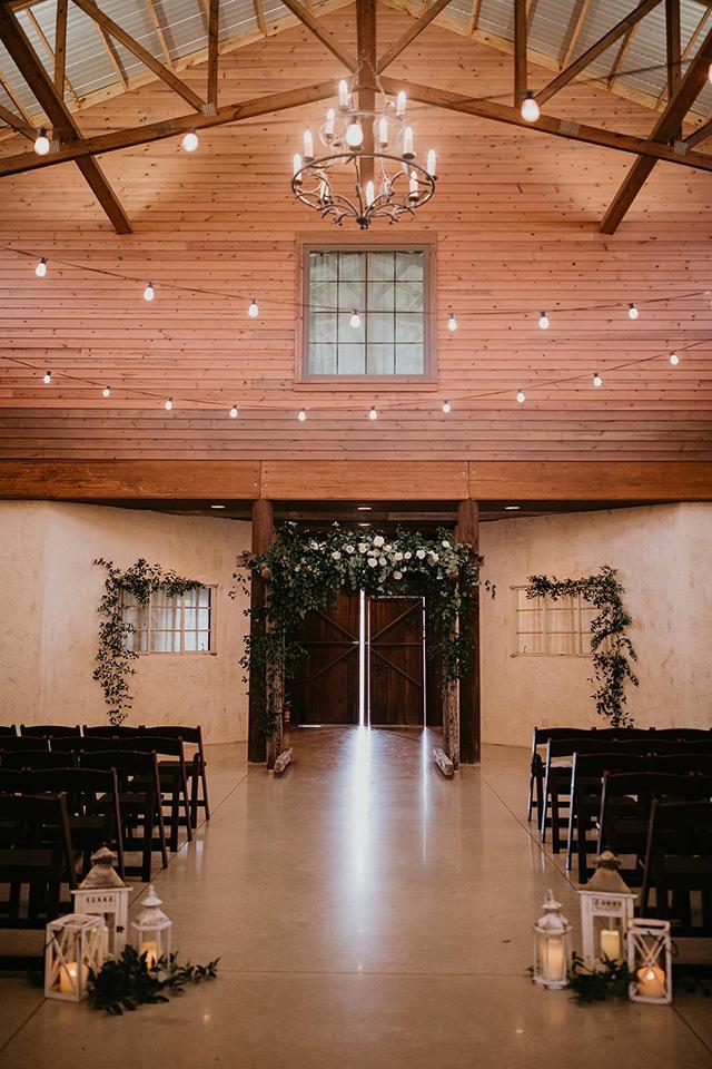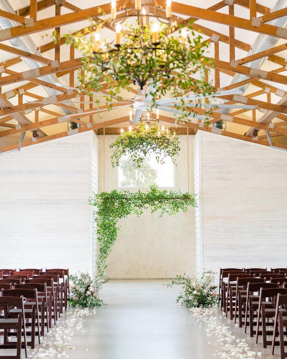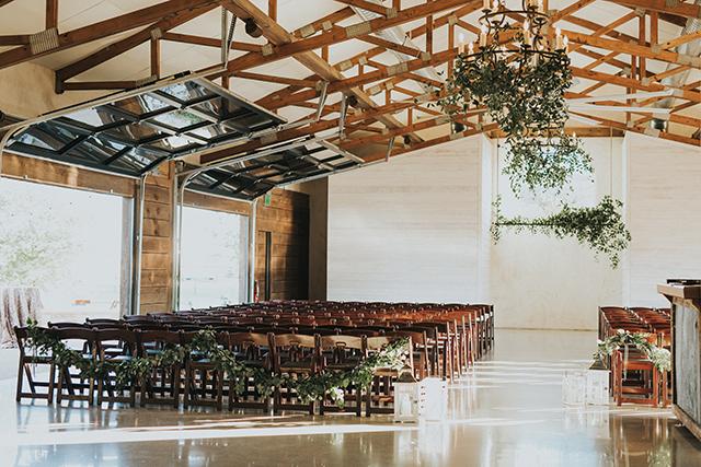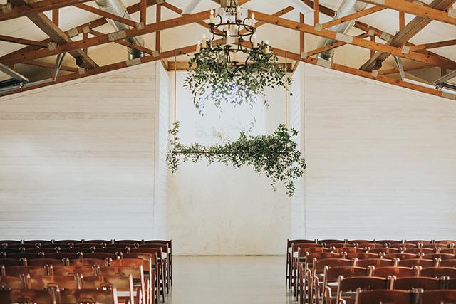 The south hall comes ceremony ready with a suspended arbor and white-washed walls.
