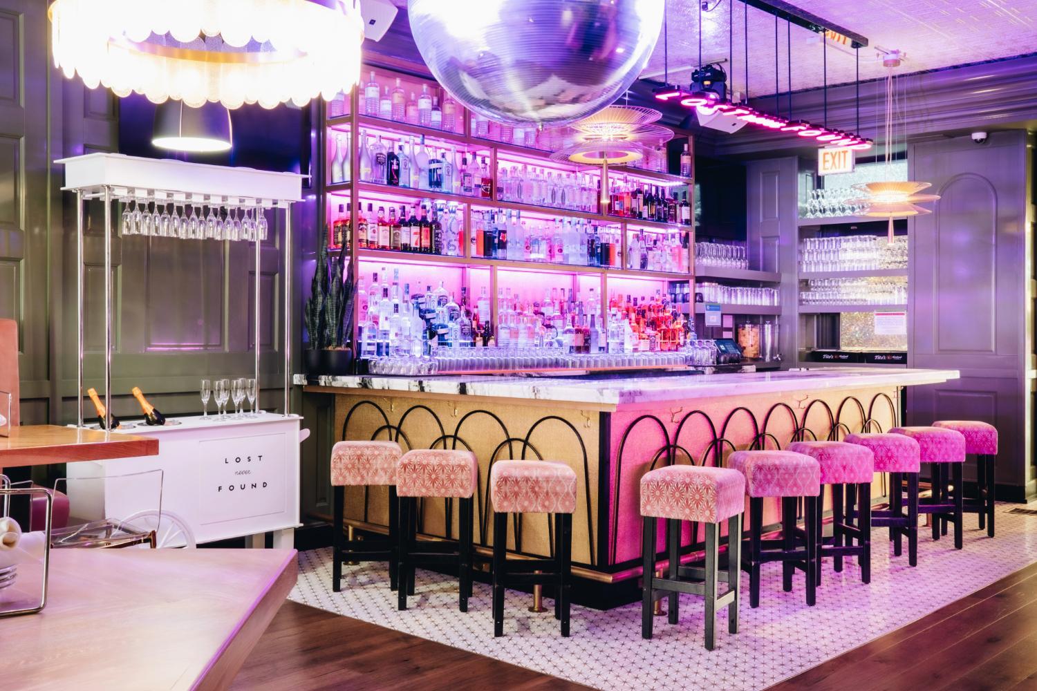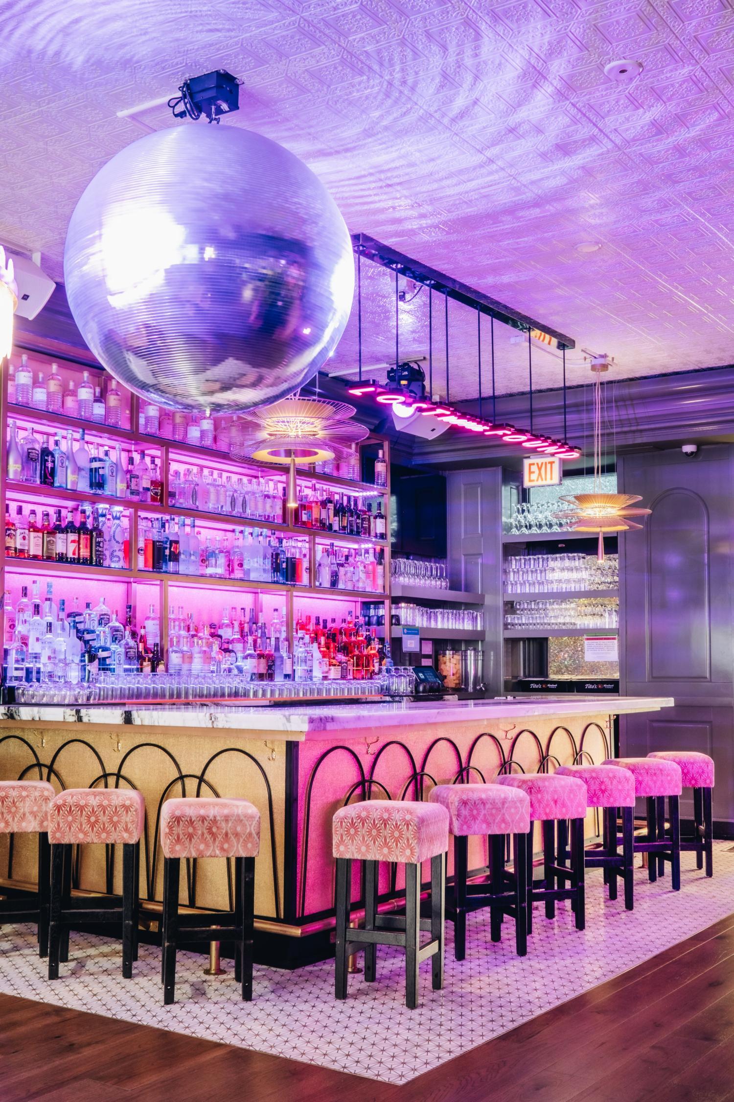 The Side Bar boasts expansive floor-to-ceiling windows and offers a variety of seating options, including booths, banquettes, and high-top tables. This semi-private space can seat up to 50 guests and includes its own private full bar. Adding to the vibrant atmosphere is a giant disco ball, making it an ideal spot for lively gatherings and special events.