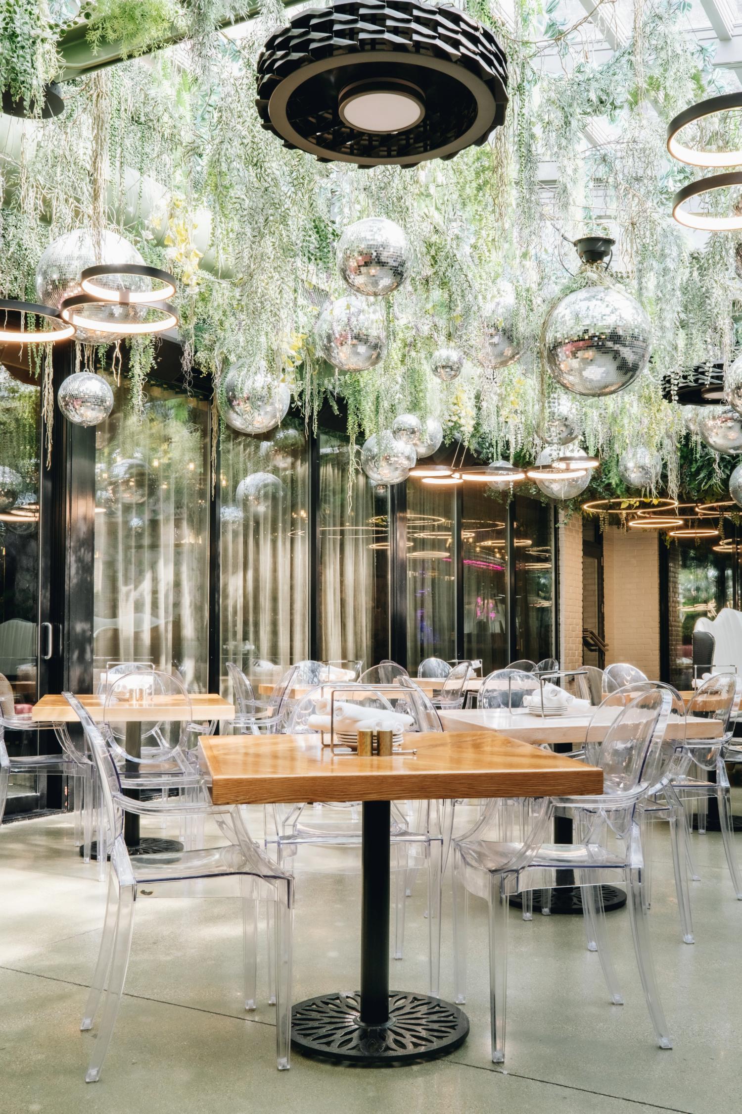 The Garden is a breathtaking space featuring a soaring glass atrium ceiling adorned with cascading vines and a cluster of disco balls floating above. Dark brick walls with greenery-filled alcoves complete the urban oasis atmosphere. With banquette seating, booths, numerous tables, and a dedicated photo-op spot with a ring light for Insta-worthy pics, this room is ideal for hosting private events. It can accommodate up to 45 guests. *Please note: the room is not temperature controlled.