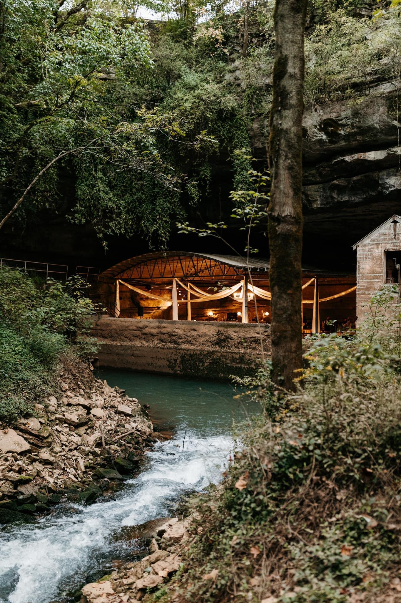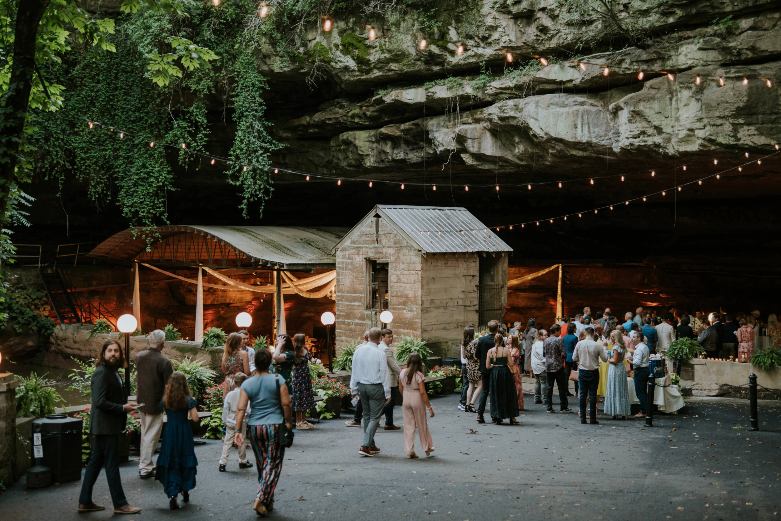 Lost River Cave can accommodate up to 300 wedding guests in its outdoor event space where intimate and grand wedding celebrations can become legendary at the rustically unique wedding venue. The Historic Cavern Nite Club is the perfect space to host an unforgettable ceremony and reception. It features the original bandstand and bar from the 1930s and a glimmering crystal chandelier that hangs above the underground club space.
