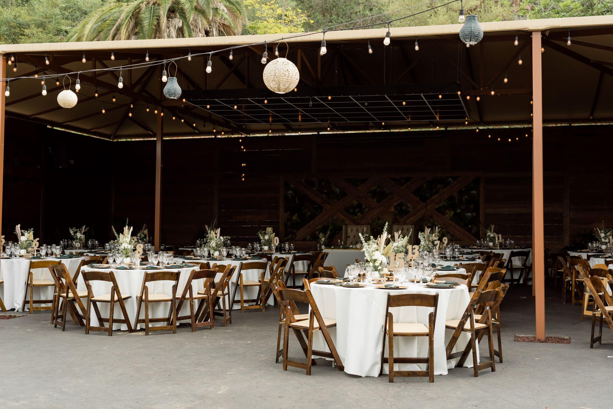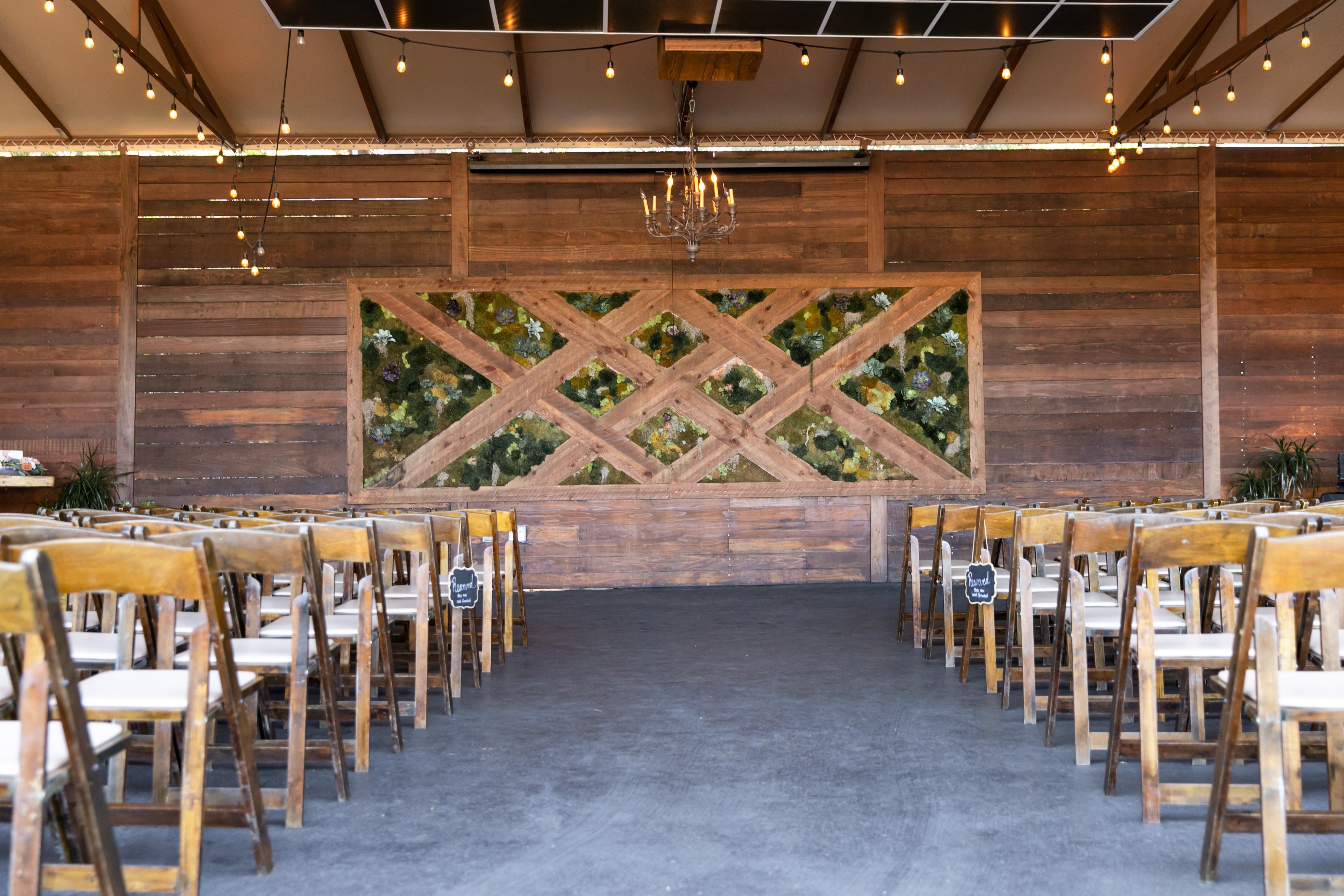 Entering through beautiful rolling wooden doors, this space features living wall arrangements and painted statement walls on every end of the venue, both of which are beautiful natural backdrops for your on-site ceremony and reception. Wine barrel cocktail tables, live-edge furniture, and a repurposed horse-trailer bar contribute to the soft rustic vibe, while our assorted centerpiece decor compliments a boho-chic or natural wedding well! The open-air format makes it an easy-to-navigate space.