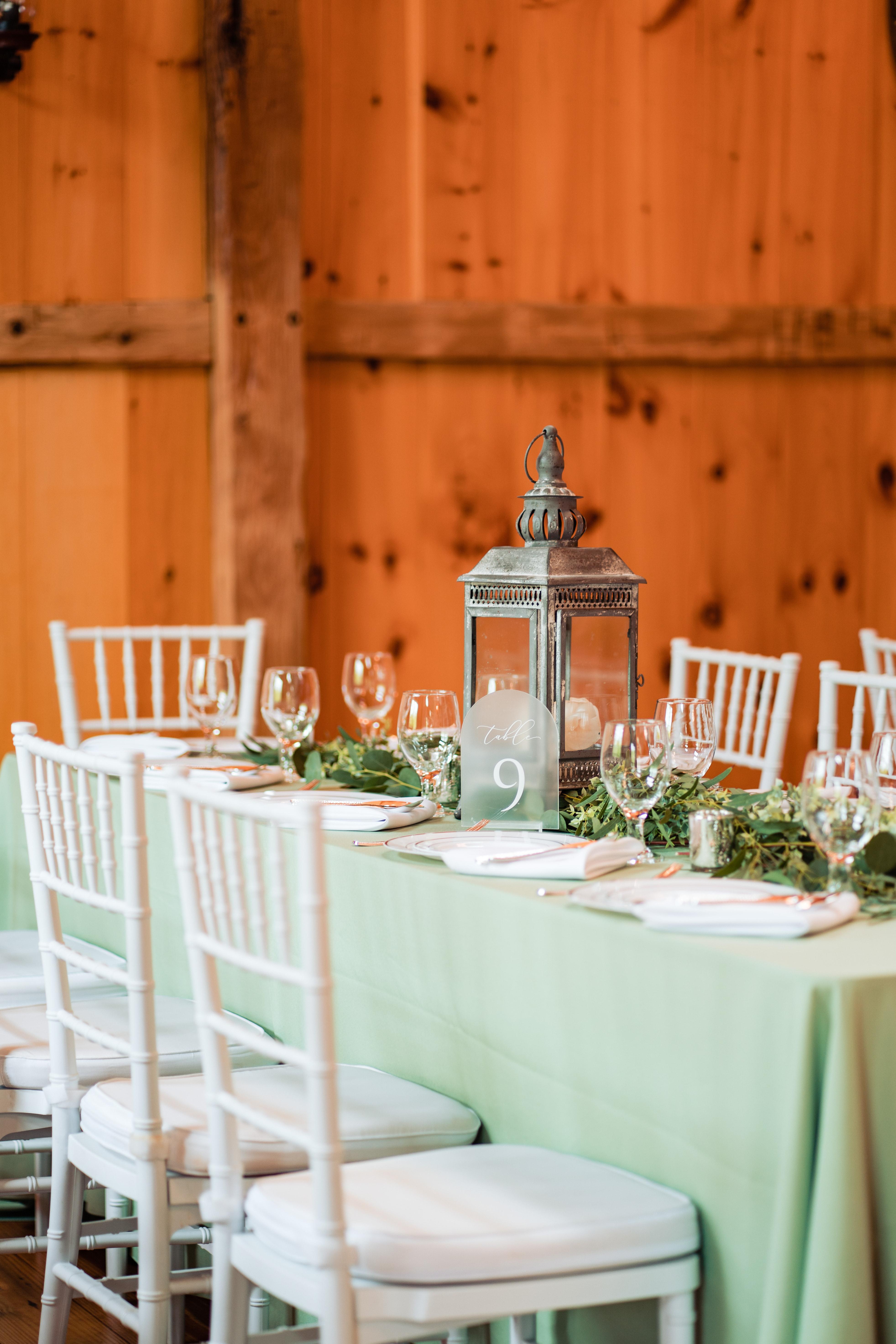 The Main (upper) level is for the reception area. This room boasts hand hewn beams and 3 hay ladders. It is set up with banquet tables and white Chivari chairs. The bride and groom have their own Sweetheart table. This area also has a room for desserts and snacks.