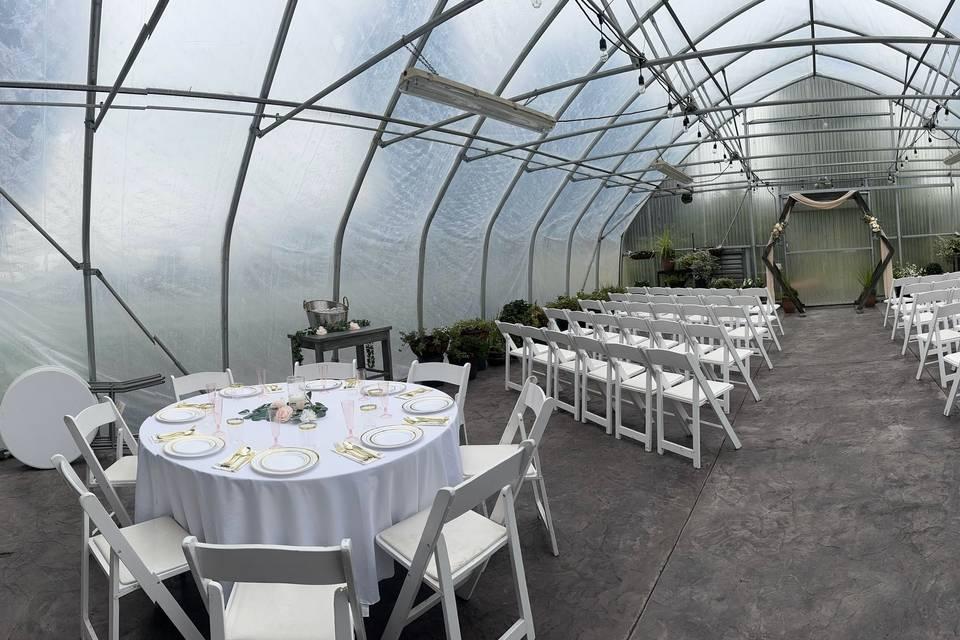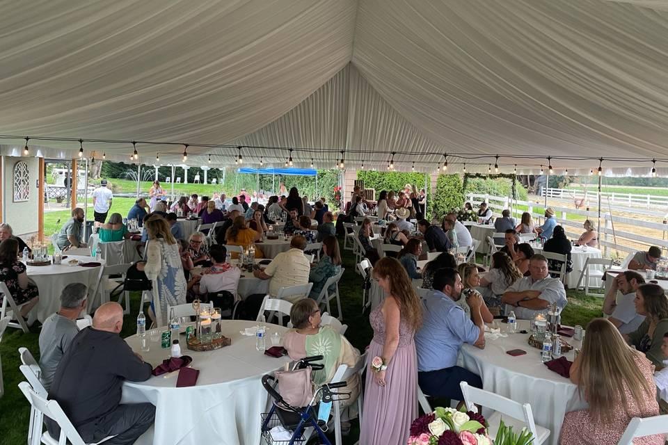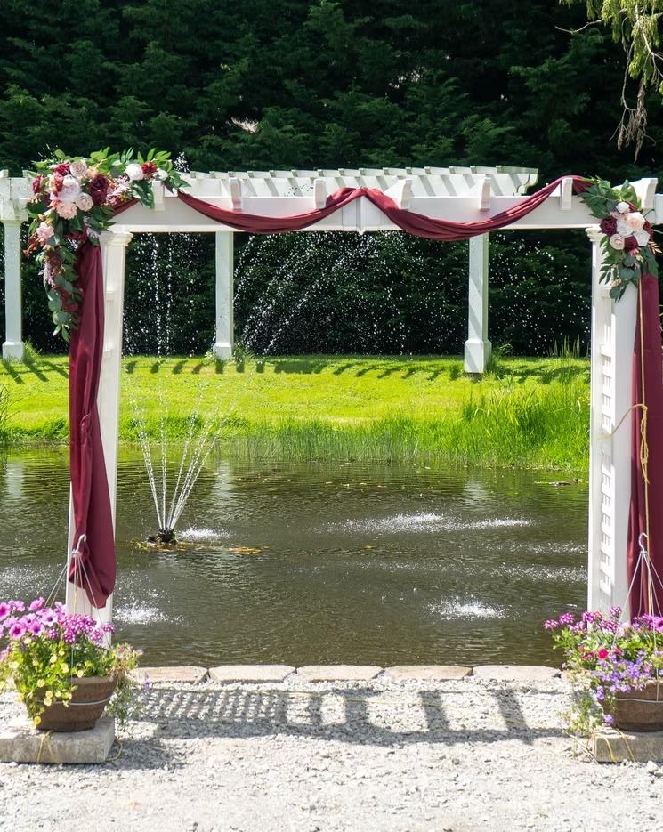 Majestic mountains, mature trees, and a sprawling lawn framed by a spring-fed pond with a serene fountain and soothing waterfall create a stunning backdrop to your event. Our lush 5-acre property can accommodate up to 250 guests and boasts Bride and Groom cottages, a large drapery-covered tent, two decorative arbors, a breathtaking enclosed glass atrium that will fit 200 guests or works perfectly to serve your food, as well as an enclosed greenhouse for the option of a spring, fall, winter or any rainy day wedding event.