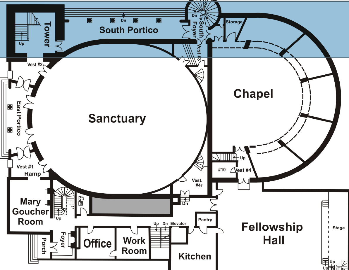 The Sanctuary is on two floors. The first floor has a main entrance that is accessible from the outside. The second floor is accessible through a staircase near the main entrance and an additional staircase in the Sanctuary.
