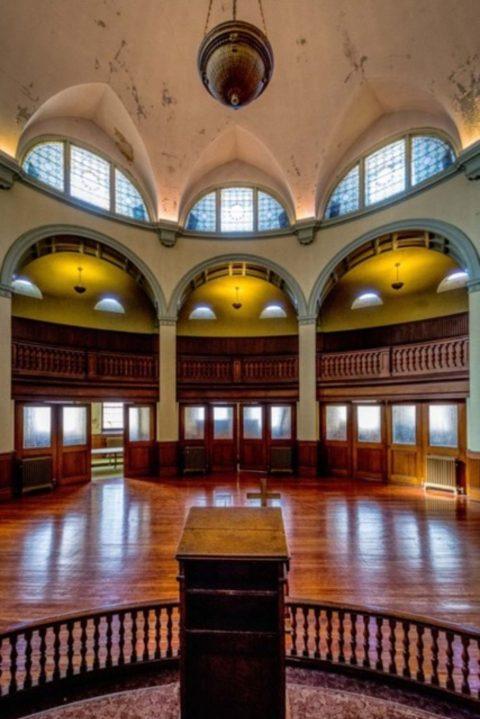 This space is 2,500 sq. ft with a 3-story high arched ceiling and natural light Tiffany windows.