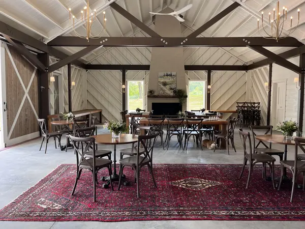 - Dimmers for total lighting customization -10 farm tables -150 crossback chairs -4 bistro tables -1 sweetheart table -Antique settee couch -Antique bar -Large vintage rugs -Mountain, vineyard and pasture views -2 bathrooms with two stalls -Food truck hook-ups -Prep kitchen -Commercial sized fridge -Fireplace full of beautiful candles -Outdoor sunken patio with fireplace -Outdoors tables and chairs -Outdoor adirondack chairs -Parking behind the building
