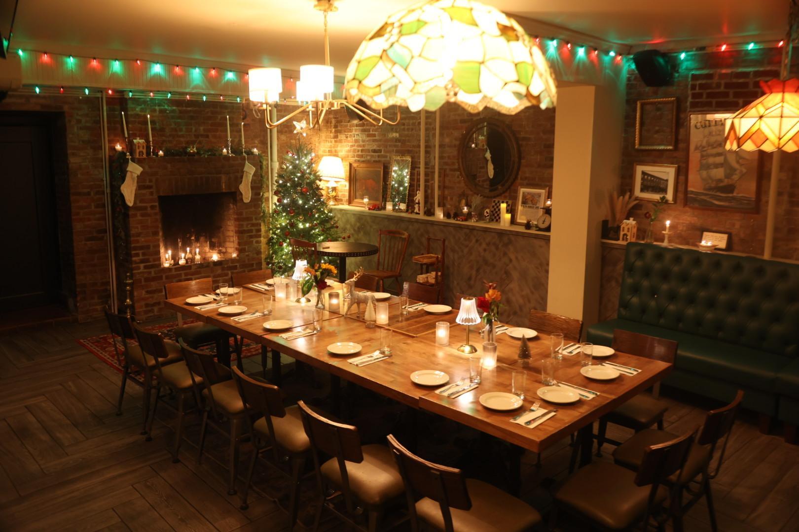 The Den which features exposed brick and an open fire place (seasonal) has flexible seating arrangements and can be cleared for a standing cocktail style event. 35 guests for a seated event or 60 for a standing reception. For use of the full Den, the food and beverage minimum is $3K for dinner (2K M-Th) and $3K for brunch Audio/Viusal capabilities for slide shows.
