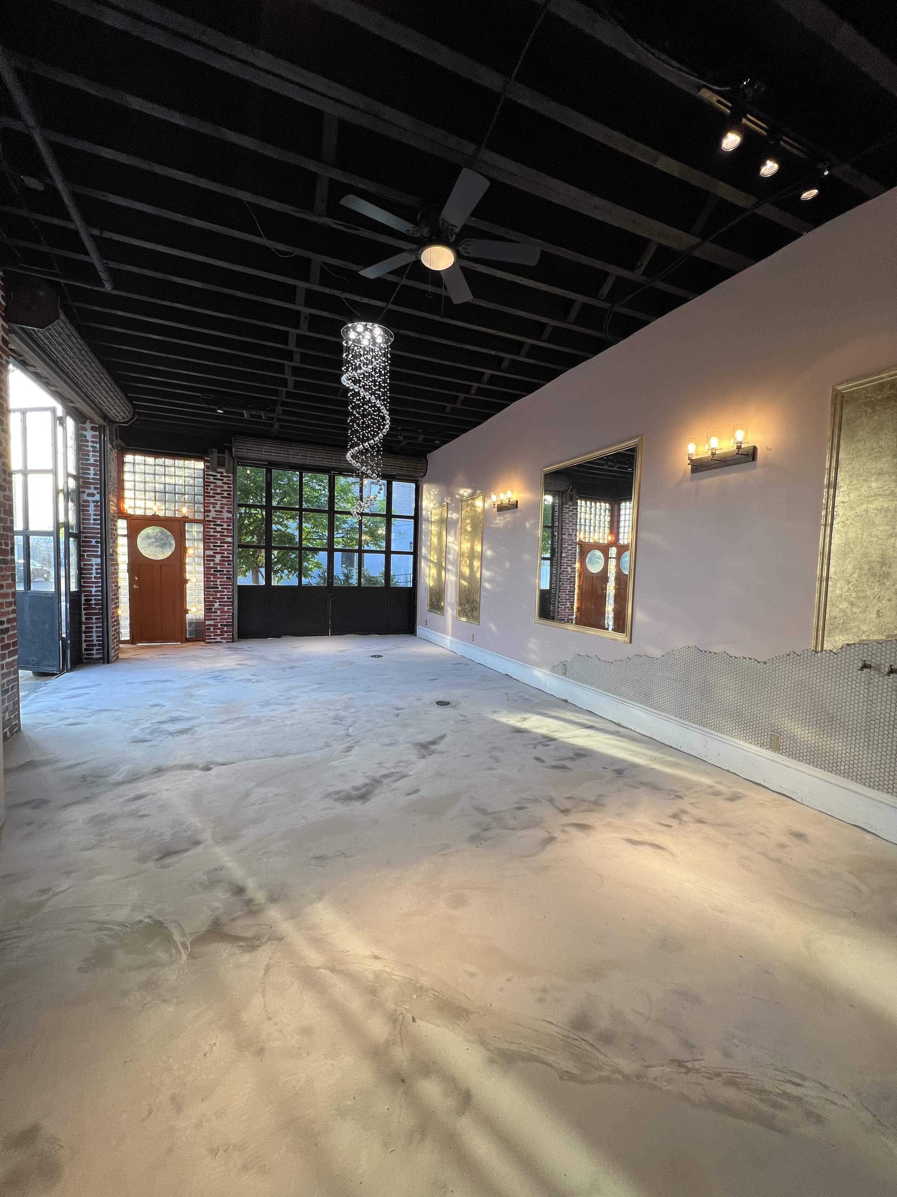 This is a modern space with golden frames, huge mirror for selfies, great windows with plenty of Sunlight, doors that open to the street level, and a wonderful chandelier.
