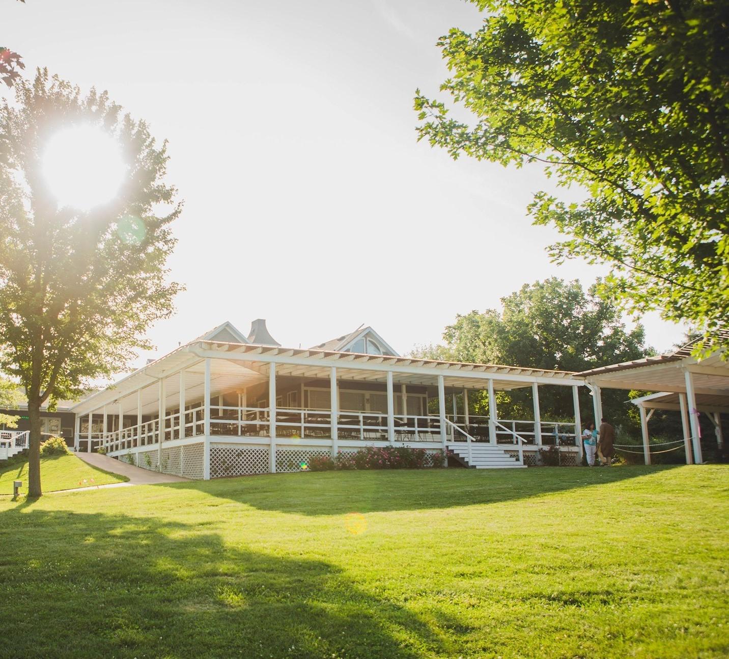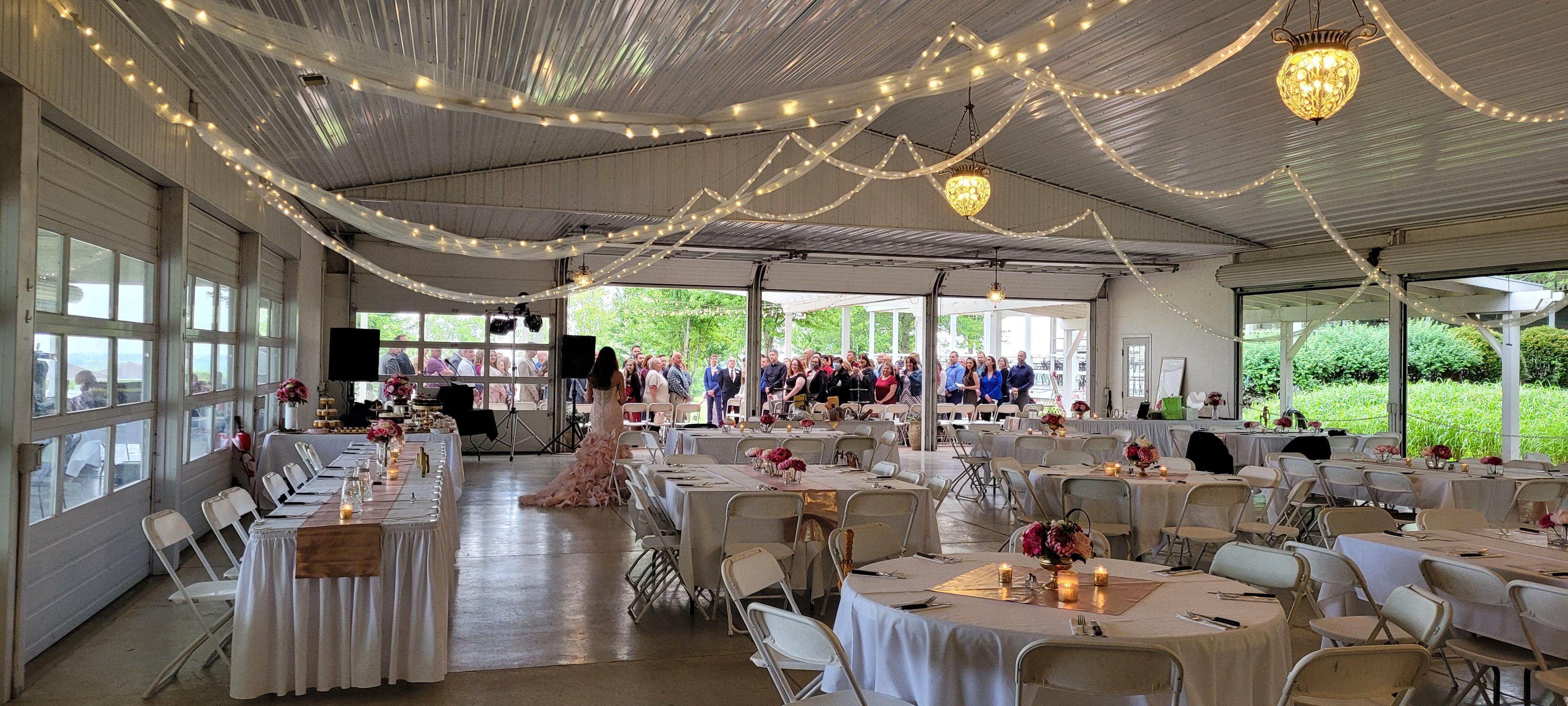 The pavilion is a unique reception building in that it has three walls that have movable doors that can be opened to allow an outdoor feel when the weather is nice. Two of the walls are a series of glass doors and still maintain the natural lighting and views of the lawn, vineyard and lake areas even if the building is closed to the elements. Our pavilion outdoor space has a covered patio area that can seat additional guests and is often used as a dance floor and social space by receptions.