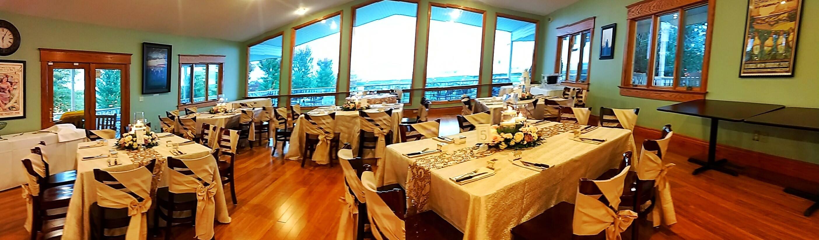 This room is set up with all the tables and chairs needed for the event. Bar service by vineyard staff, and an adjacent room for a dinner buffet. The entire back wall of the room is a large, peaked window with a beautiful view overlooking the valley.