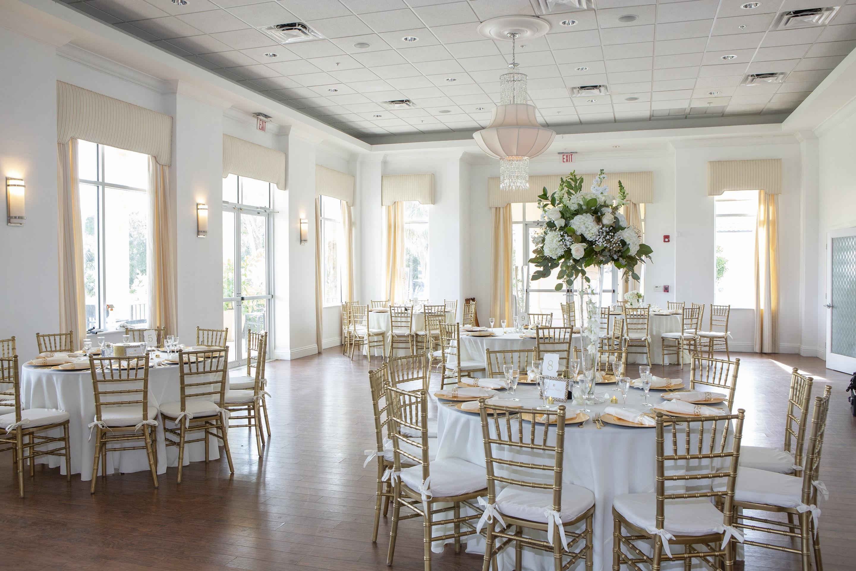 Accommodating up to 180 guests, the beautiful Madison Ballroom features windows that allow natural light and sweeping views of our top-rated, perfectly manicured golf course. Our white interior and hardwood floors are an ideal canvas for unlimited linen, floral, and decor options.