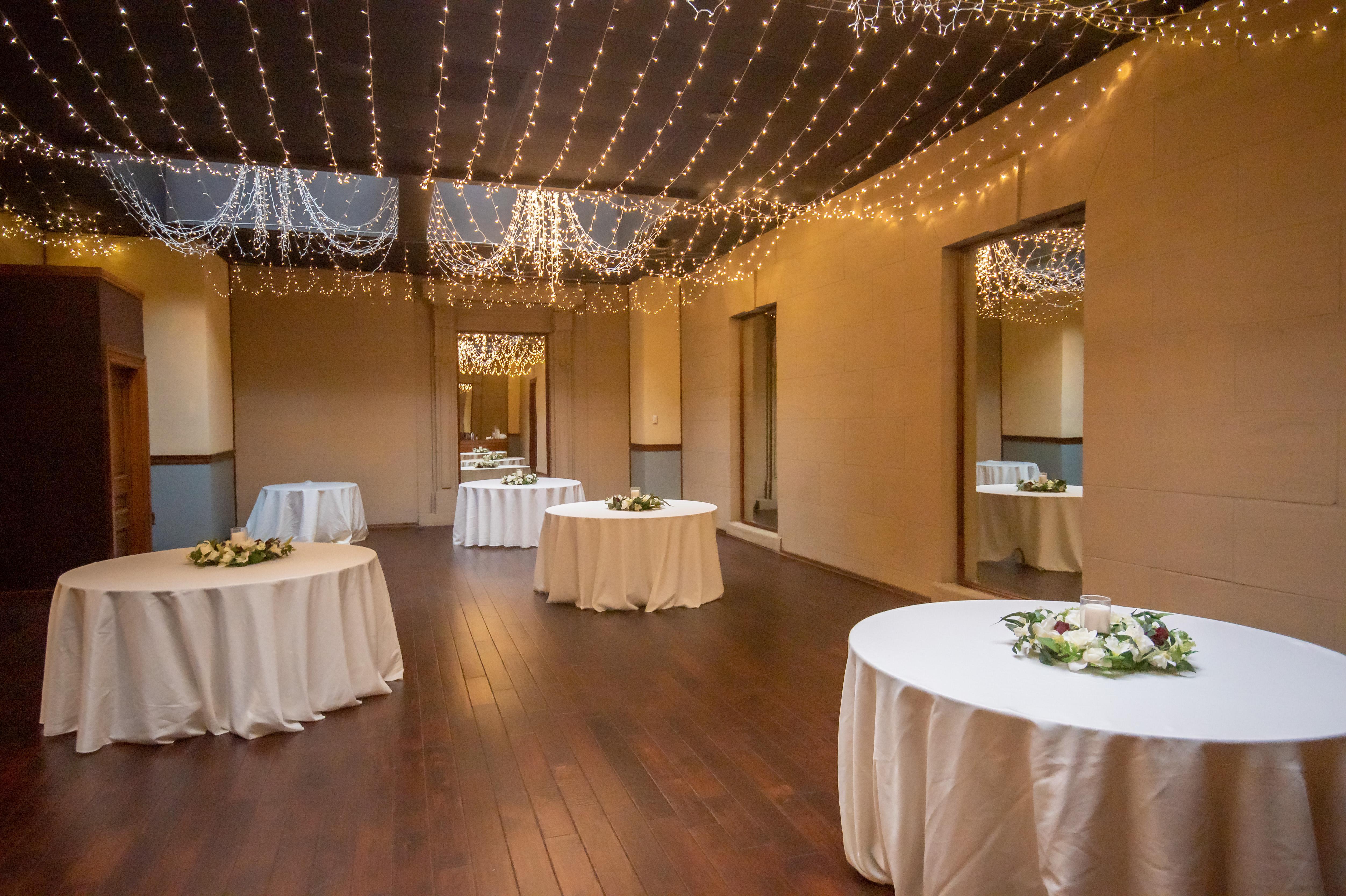 This is the larger of our 2 rooms and works well for wedding ceremonies and receptions. Beautiful woodwork, hand carved ceiling, gorgeous chandeliers and a historic look to our ballroom makes it a treat for all! Beautiful hardwood floor area for tables and tile area in the middle perfect for dancing or a ceremony aisle! Can be booked by itself or in junction with the atrium.