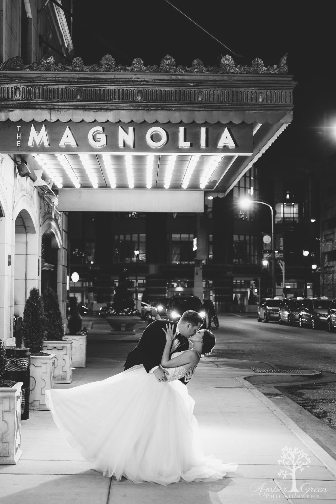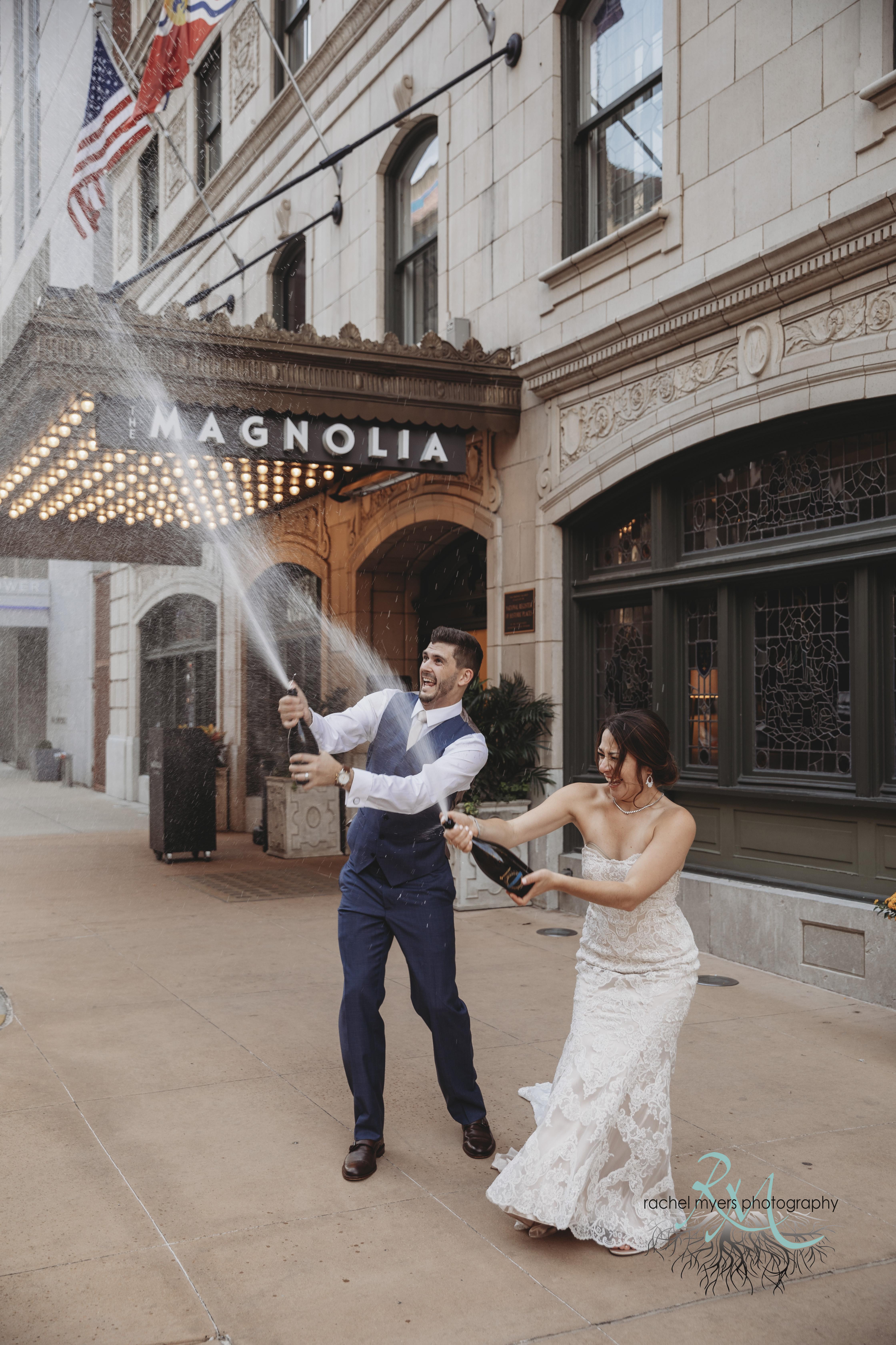 Magnolia Hotel St. Louis is a sophisticated hotel wedding venue located in St. Louis, Missouri. Nestled in the heart of downtown, this unique hotel exudes old Hollywood glamour, giving you and your guests an experience to remember for a lifetime. With 182 guestrooms and suites, you are your guests can enjoy their comfortable overnight accommodations. The Magnolia Ballroom comes to life with our boasting floor to ceiling windows overlooking the beauty of the Old Post Office Plaza as well as the memorable flavors and artisan creations of our Executive Chef. Photo credits: (personal information protected by Zola) (personal information protected by Zola)