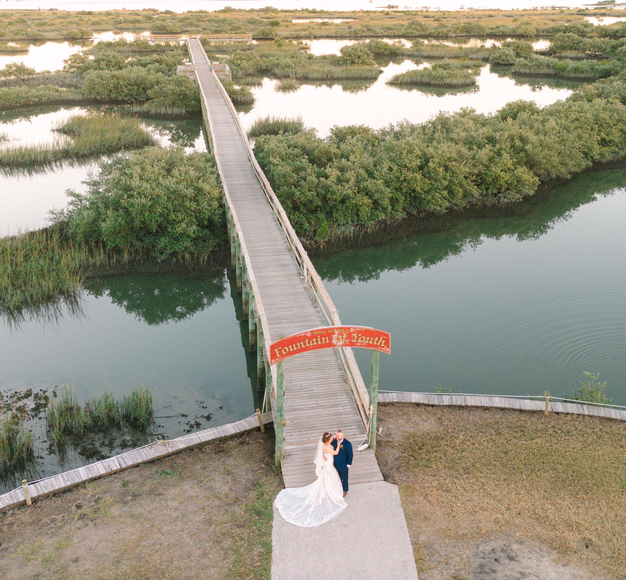 The Magnolia Room is situated at the Oldest City's most historic property, the Fountain of Youth. The Park features 15 acres, making it a great space for weddings, rehearsal dinners, farewell brunches, & other special occasions. There is complimentary onsite parking. The property offers views of the Matanzas River. In addition to that ever-popular water view, there are exotic peacocks wandering the grounds. The Magnolia Room is a 2,500 square foot enclosed event space, with retractable bay doors opening to two open-air patios, adding an additional 2,800 square feet for additional guest seating or a dance floor. There is a private sitting room & a caterers' prep kitchen inside. The Celebration Cottage can accommodate wedding parties on their special day. Equipped with mirrors, private restroom and shower, refrigerator, large screen tv, lounge seating, & more. Choose your ideal setting for your ceremony. Options include The Peacock Garden, waterfront, the Spanish Mission, & more.