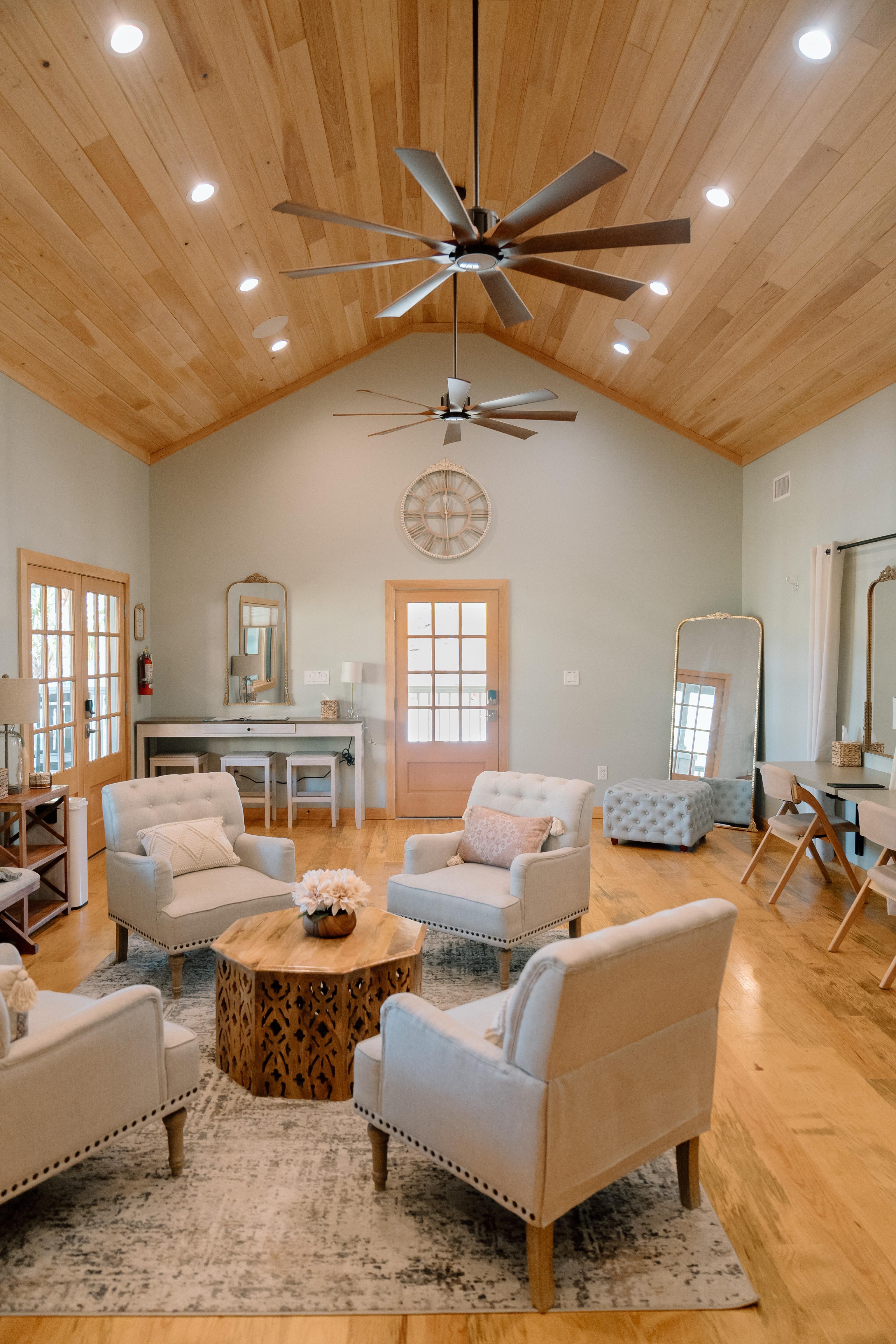 The Celebration Cottage can accommodate wedding parties on their special day and serve as a main event space for smaller functions. Equipped with mirrors, private restroom and shower, French door refrigerator, wall mounted large screen TV, surround sound, lounge seating, wrap around porch with rocking chairs, & more.