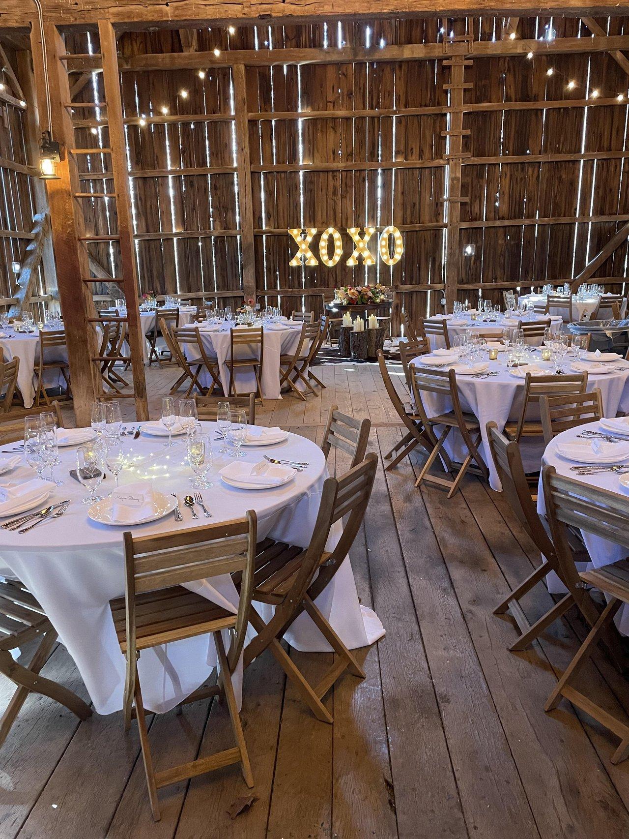 Please contact us for a full list of inclusions. A simplified list: Round tables (rectangular available with additional fee). • Premium wooden bistro reception chairs and white padded garden ceremony chairs. • Basic set up of tables, chairs in your choice of layout. • Access to our full decor closet inventory, vintage furniture and more. • Access to the entire farmhouse areas (full two-story historic house and separate summer kitchen with loft for both sides of the wedding party to relax, get ready). • Exclusive use of the barn, farmhouse, patio and grounds for the day. • Venue Manager on-site and golf cart shuttle to/from parking area before the ceremony. • Security Guard. • Ability to bring your own vendors. • Floral options (bulk buckets to DIY, ala carte, or full service) and additional floral discounts from our design studio.