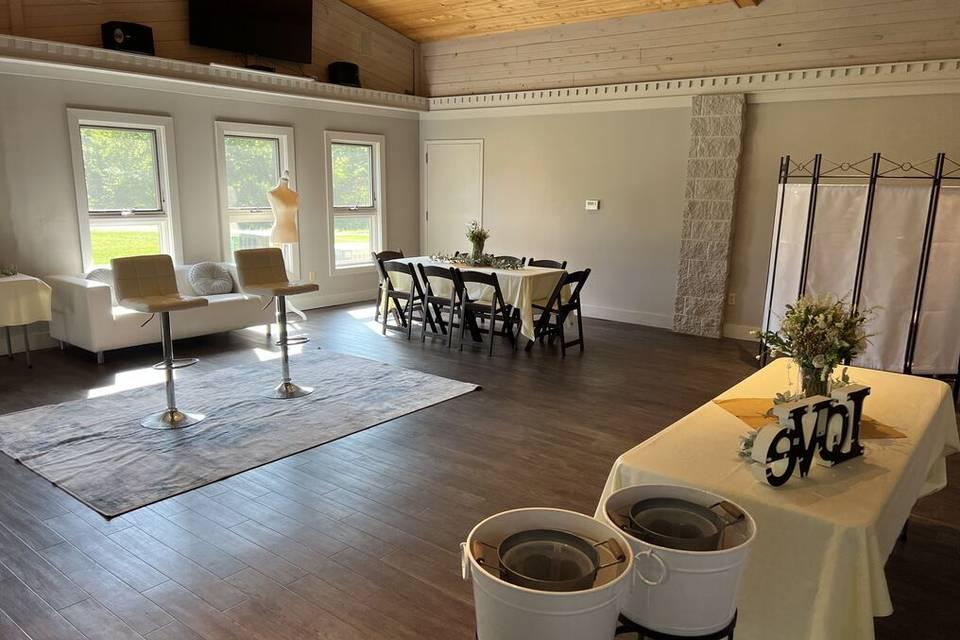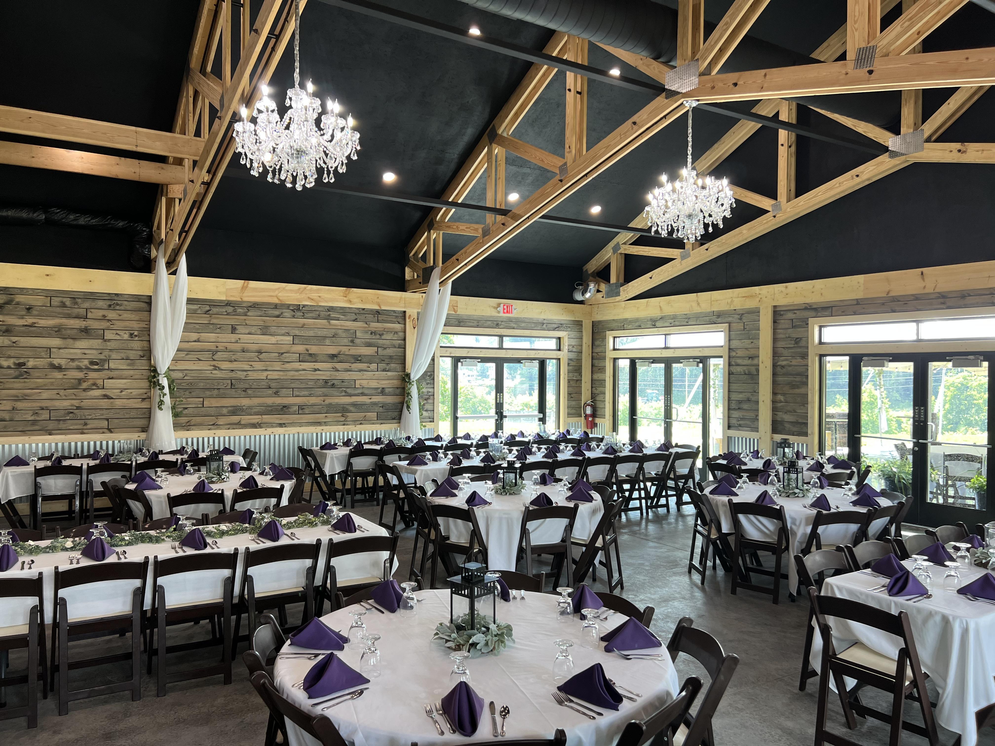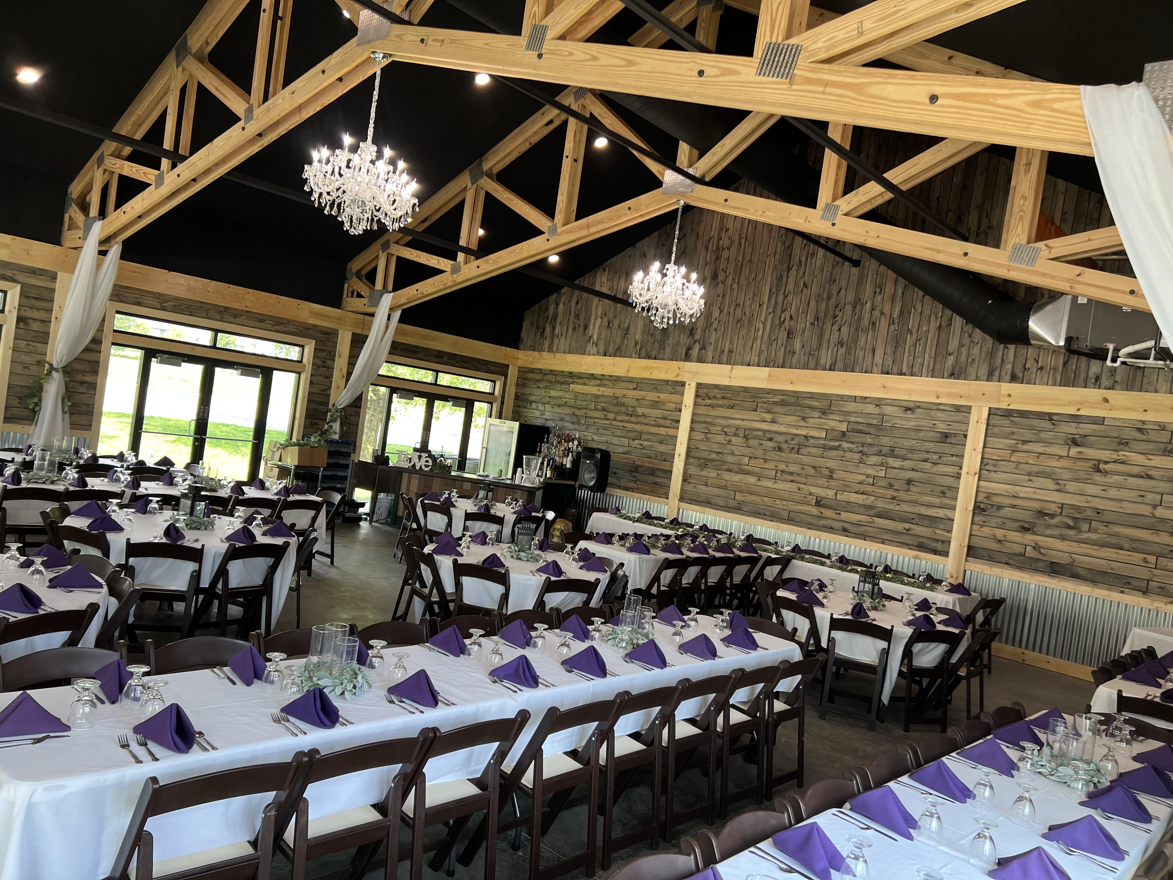 -Dimmers for total lighting control - Eye Catching Chandeliers - Edison bulb lights for fairytale wedding dance area - Drapery - Full Bar - Tables and chairs setup for you - Beautiful open beam concept - Custom stained wood walls create amazing focal points