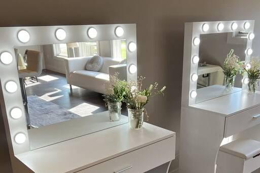 Hair and makeup chairs Lighted vanities White leather sofa Changing area Bluetooth speaker Breakfast/lunch tables and chairs Dress hanging space