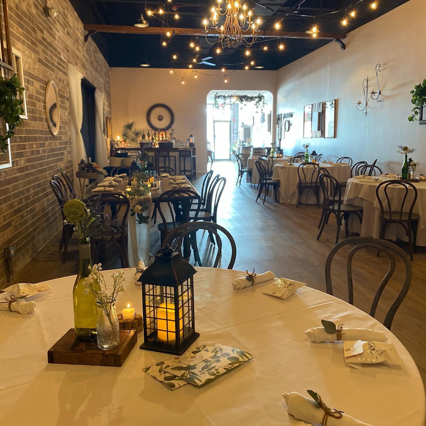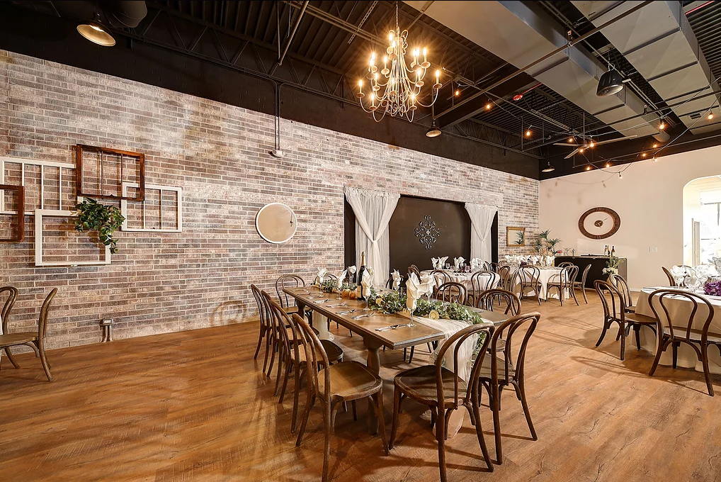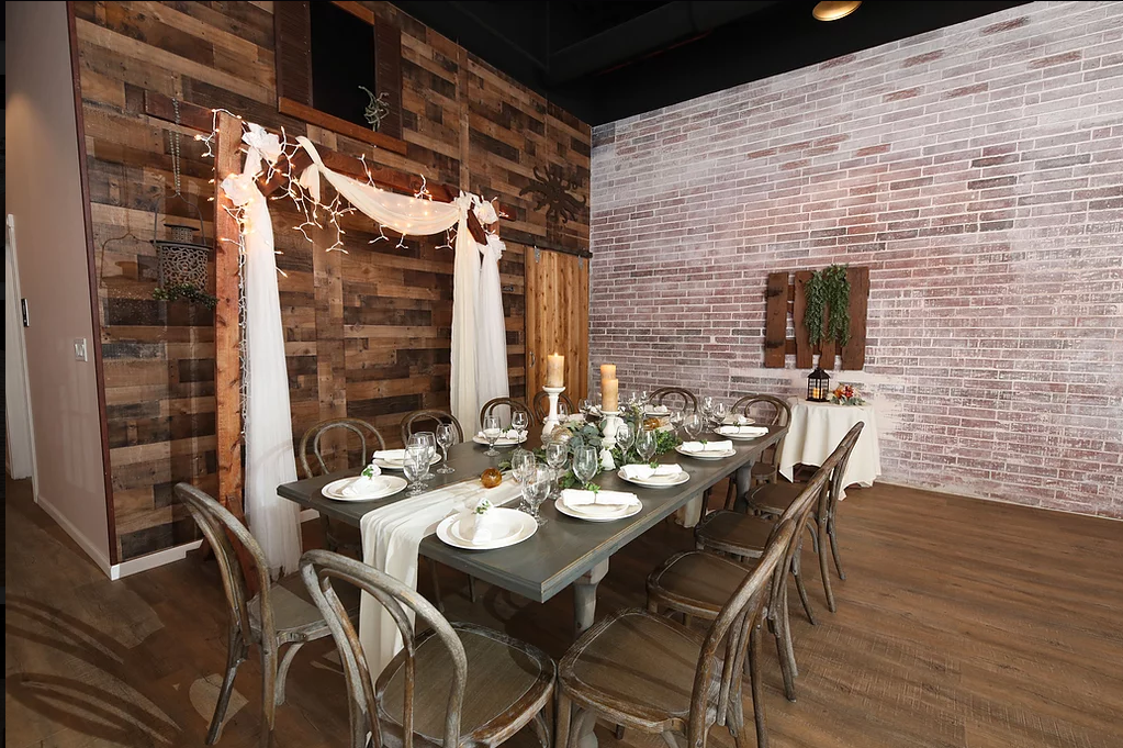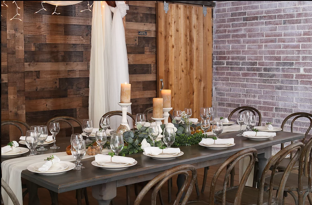 The venue is equipped with large round tables and a large farm-house head table to host up to 100 guests.Floor-Length, White Linen Table Coverings. China, Glassware, Silverware. Access to the Outdoor Cigar Lounge. Access to the Bridal Room.