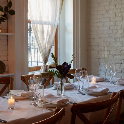 Guests can float effortlessly between the event spaces and enjoy boho-chic vintage vibes in a vibrating, urban setting. The elegant, white Parlor Room with its original details and crown moldings stands in spectacular contrast to the warmth of the Maison May dining room in the style of a French country home. Everything gets tied together by the lush, green garden that hides at the back side of the building. The Brownstone allows a large variety of setups for all kind of groups.