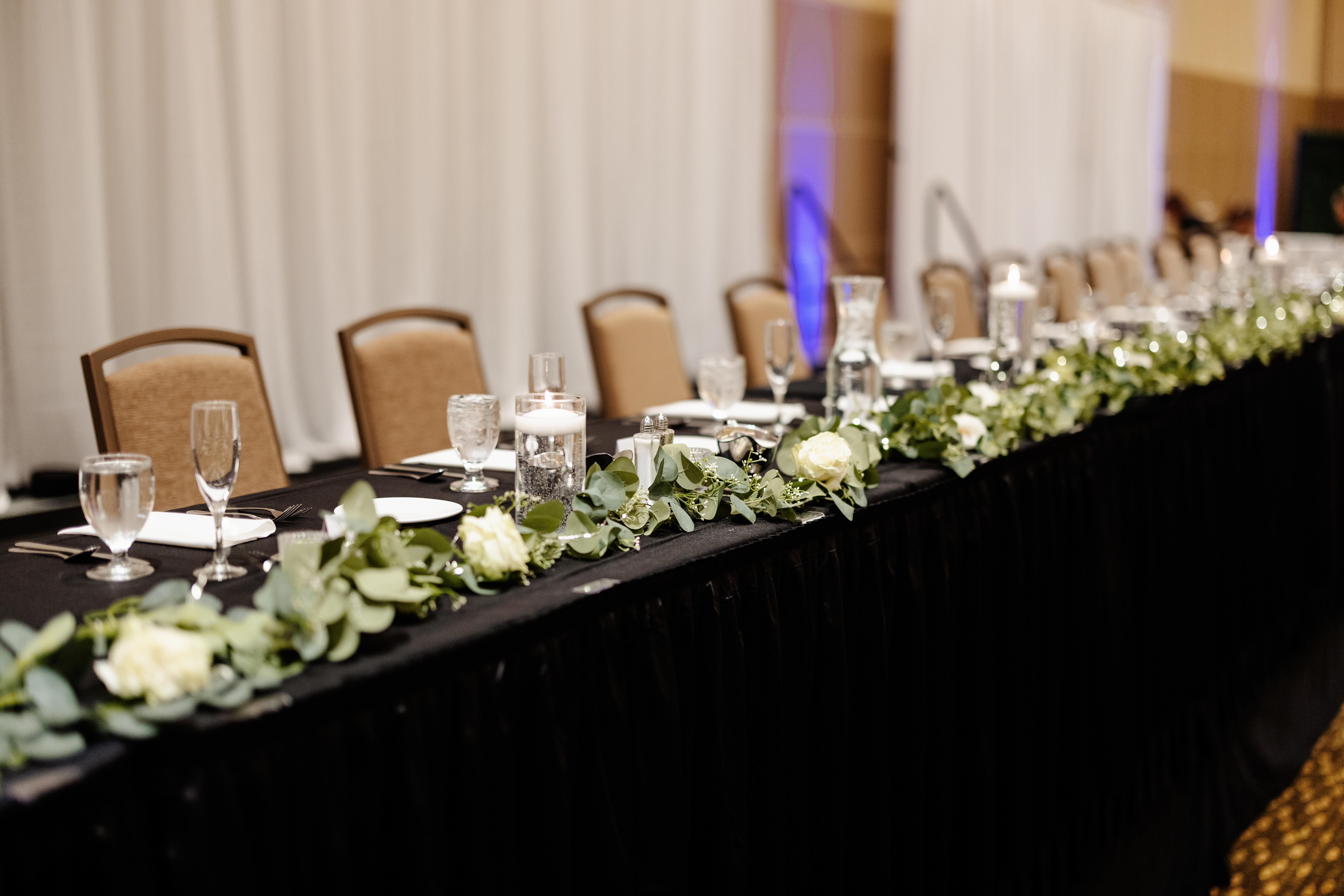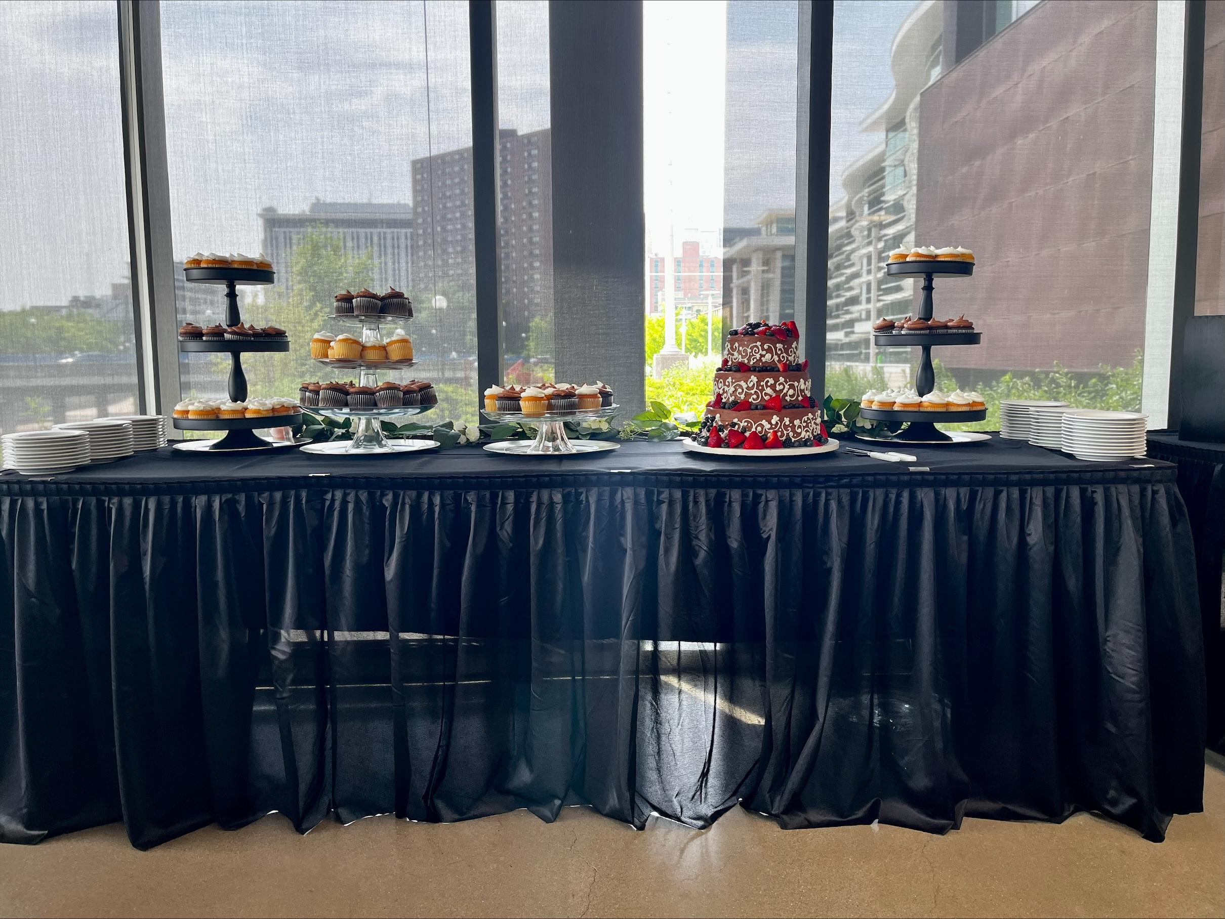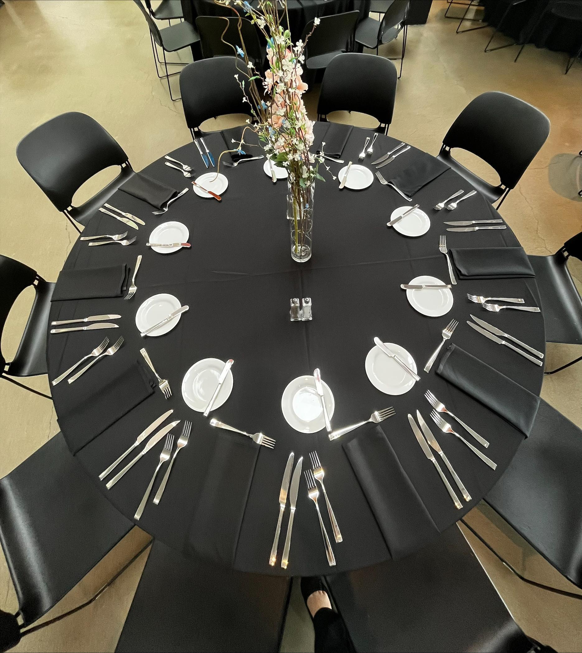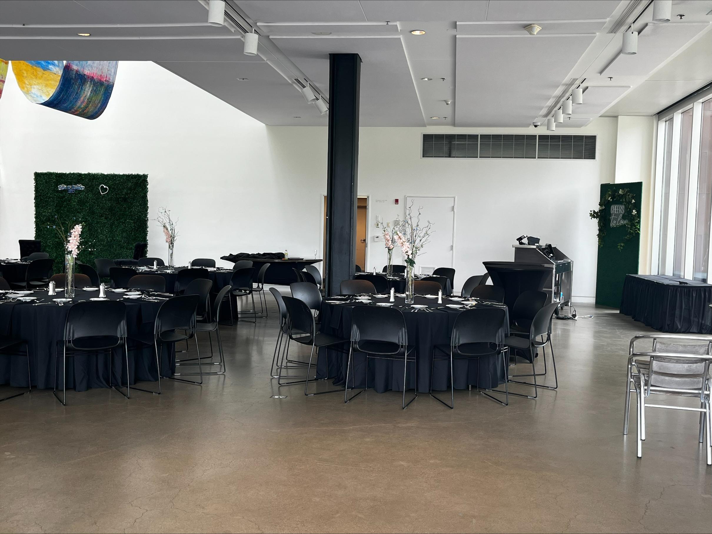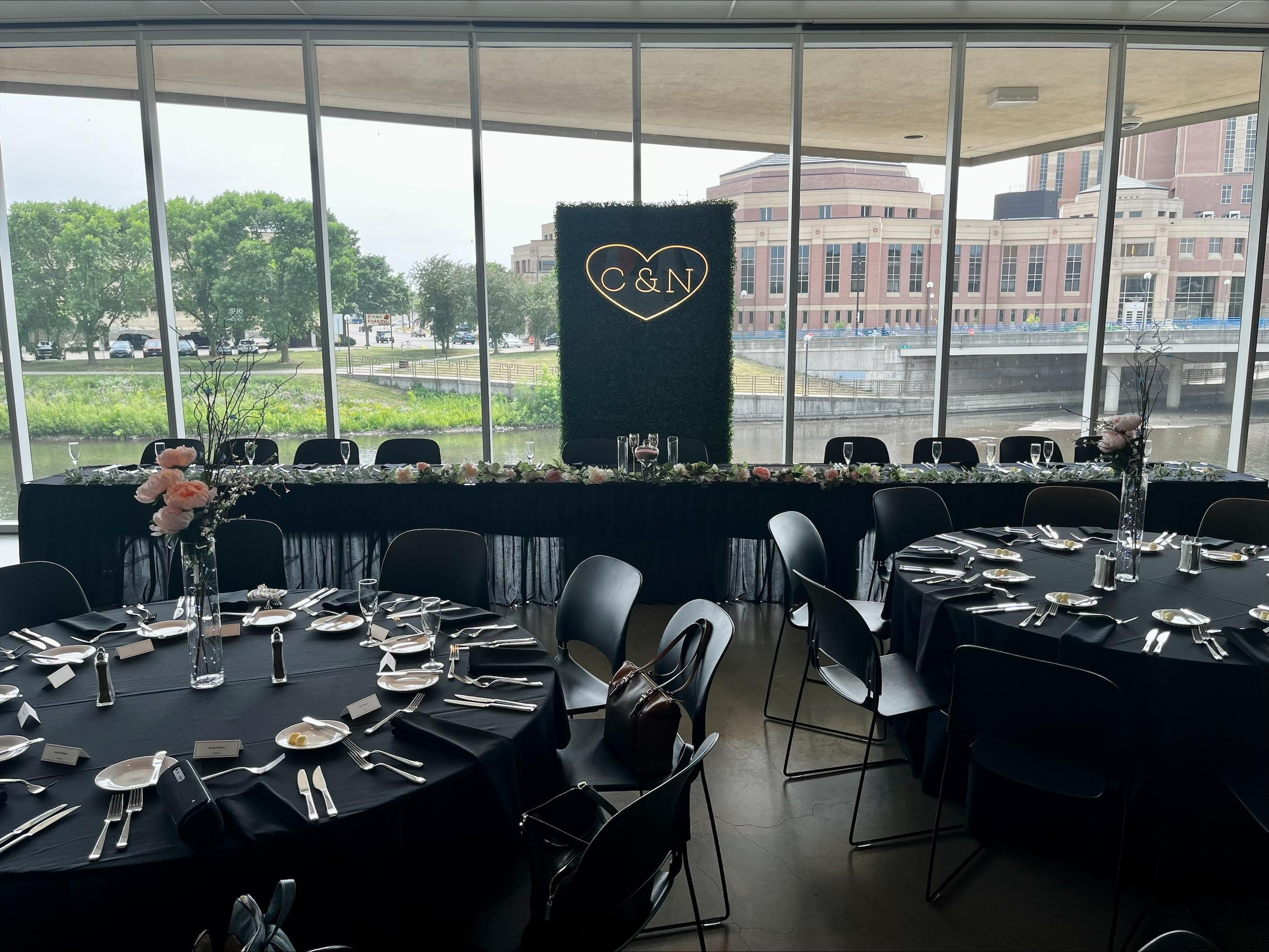 Personalized floorplans Tables and chairs Floor length linens (black and white) Linen napkins (Black and white) House centerpieces Noon – Midnight Covered on-site parking ramp and security.