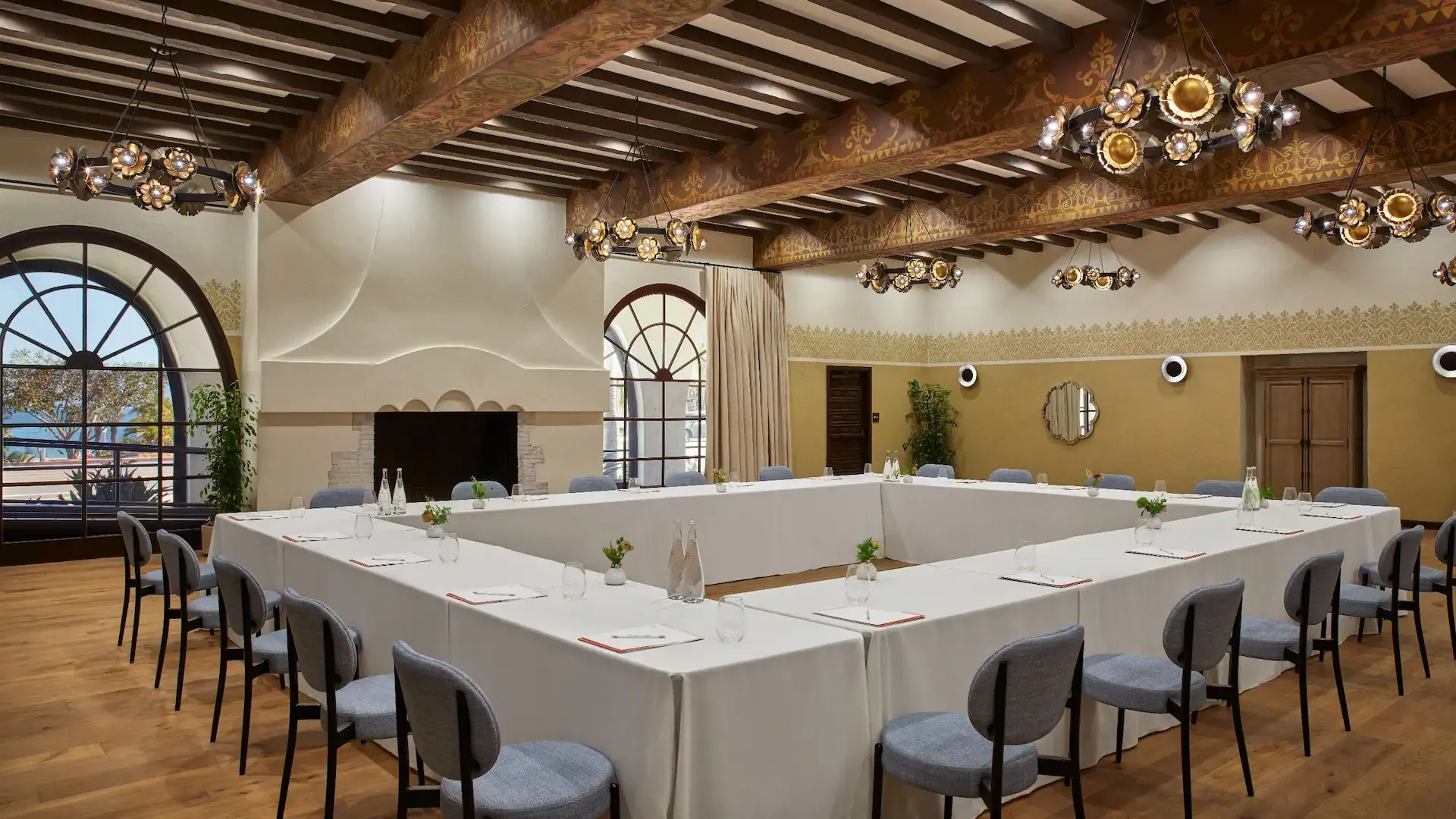 Located in the original hotel lobby, the Fireside Ballroom perfectly balances old and new with fully restored hand-painted ceiling beams from 1931 matched with contemporary chandeliers, unfinished hardwood flooring, and an impressive fireplace.