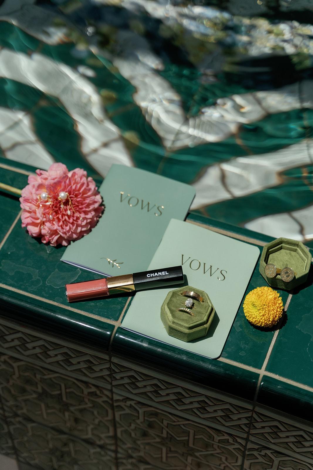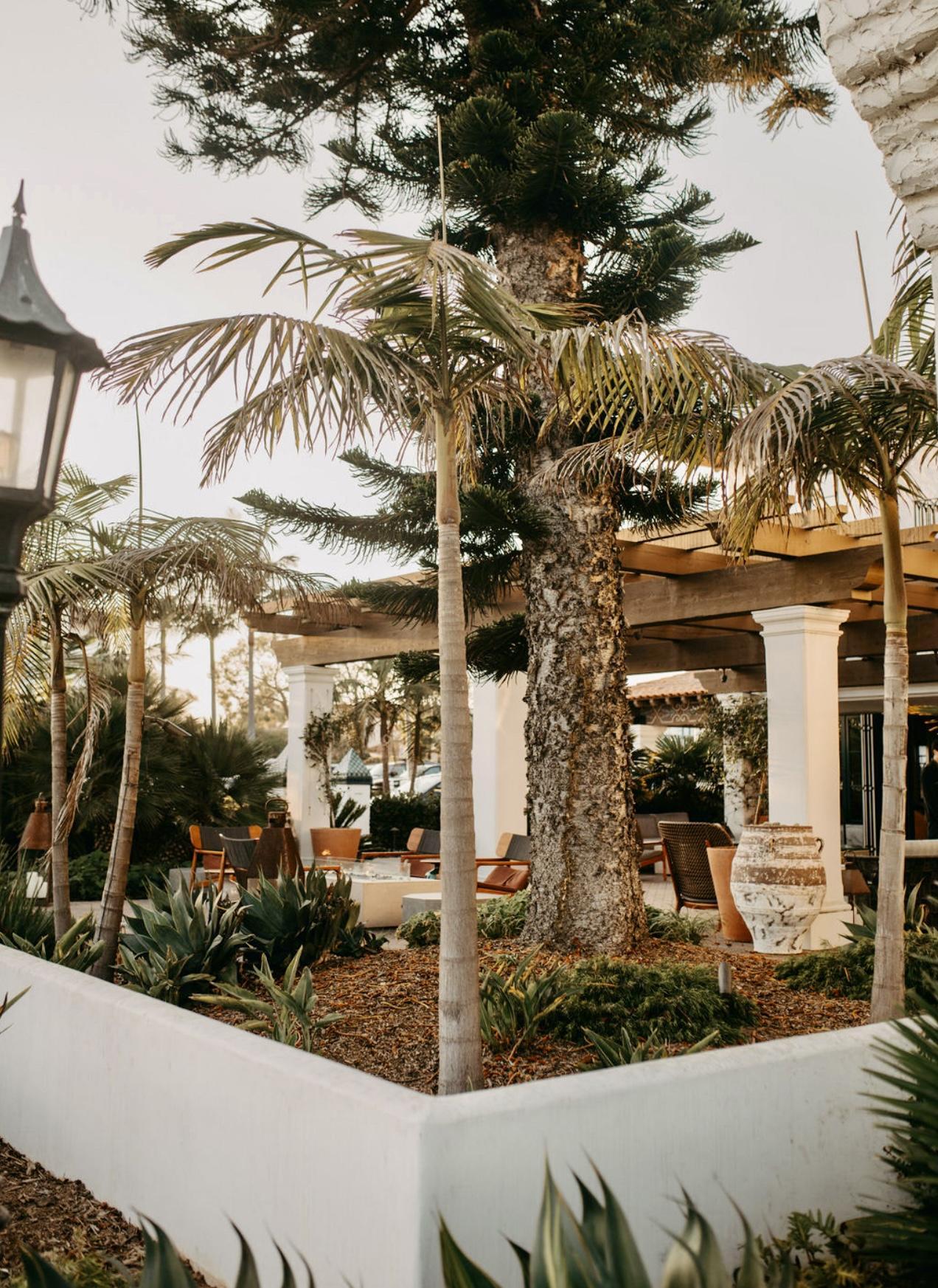 Surrounded by palms and florals, the Lobby Terrace and adjoining Living Room features a gorgeous fountain, three fire-pits and track lighting. This is a perfect venue for up to 100 guests in a reception-style event.