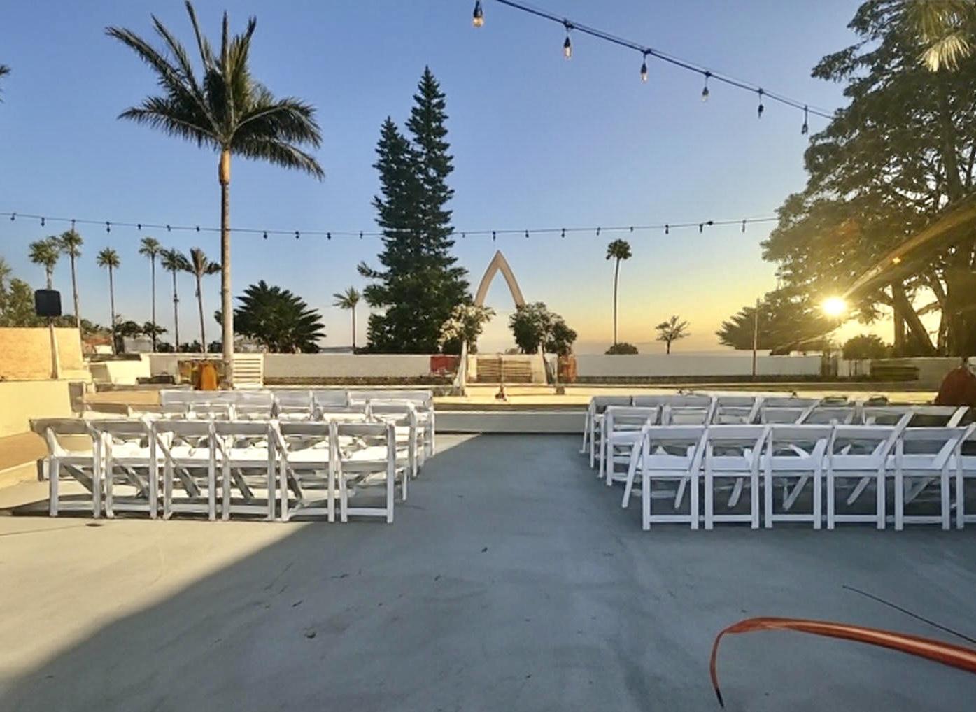 - White folding chairs for ceremony.
