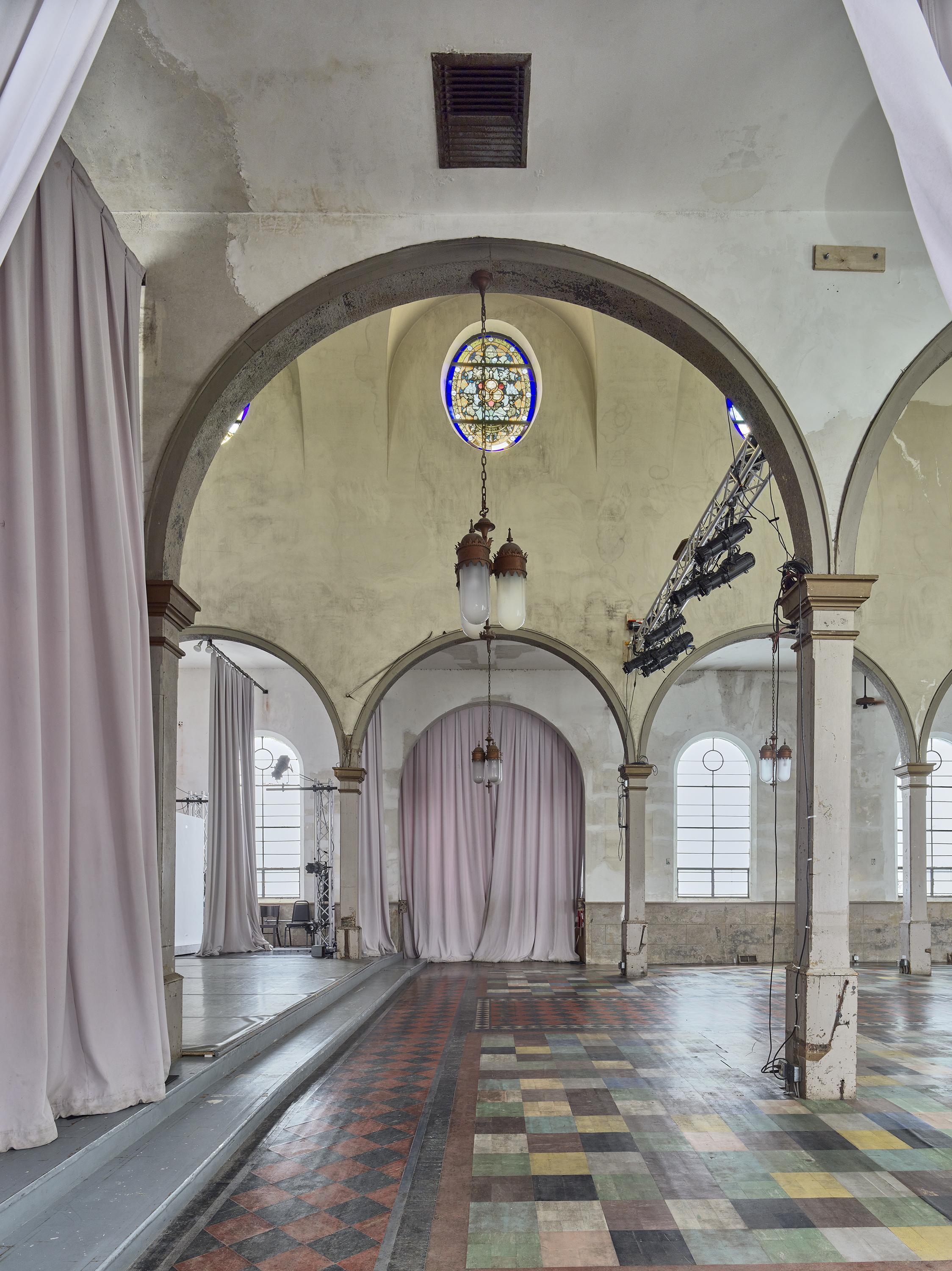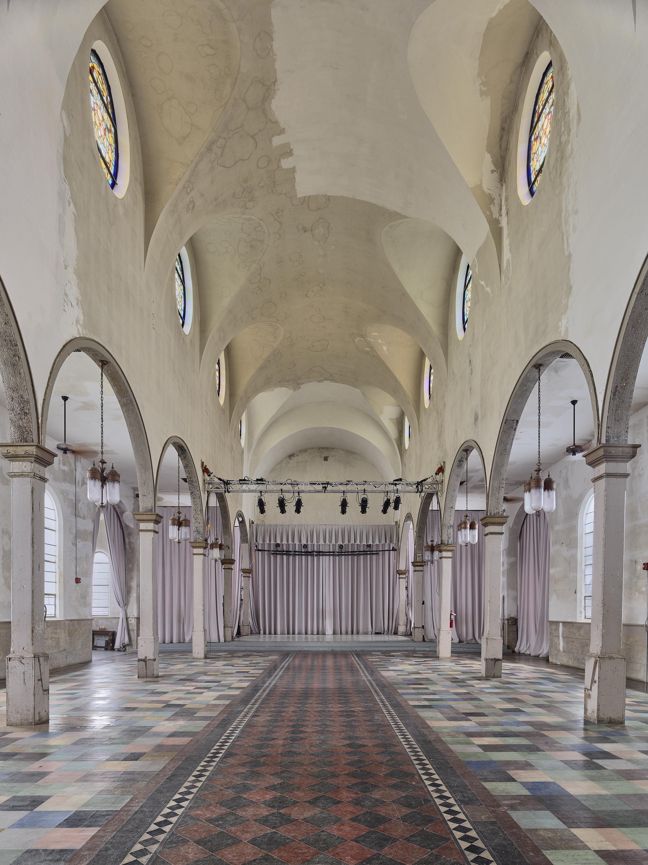 A decommissioned 1853 church-flooded with natural light and filled with rustic charm-gives colorful tile, stained glass, wood, and vaulted ceilings.